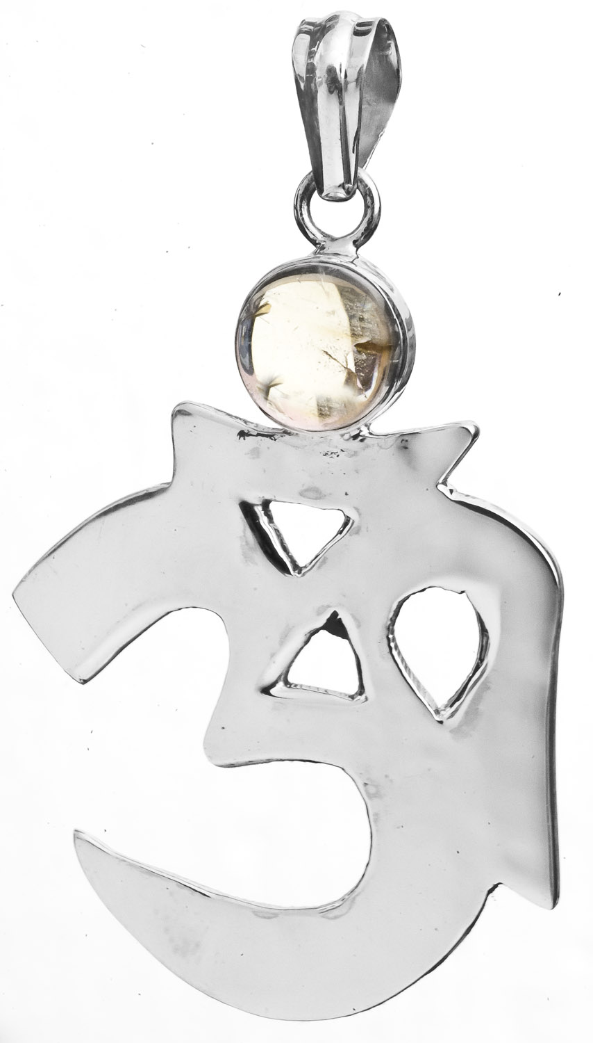 This Sterling OM (AUM) Pendant is adorned with gems and is a symbol of the infinity of the sound of OM. The sterling silver setting adds a touch of elegance, while the embedded gems infuse vibrant energy.