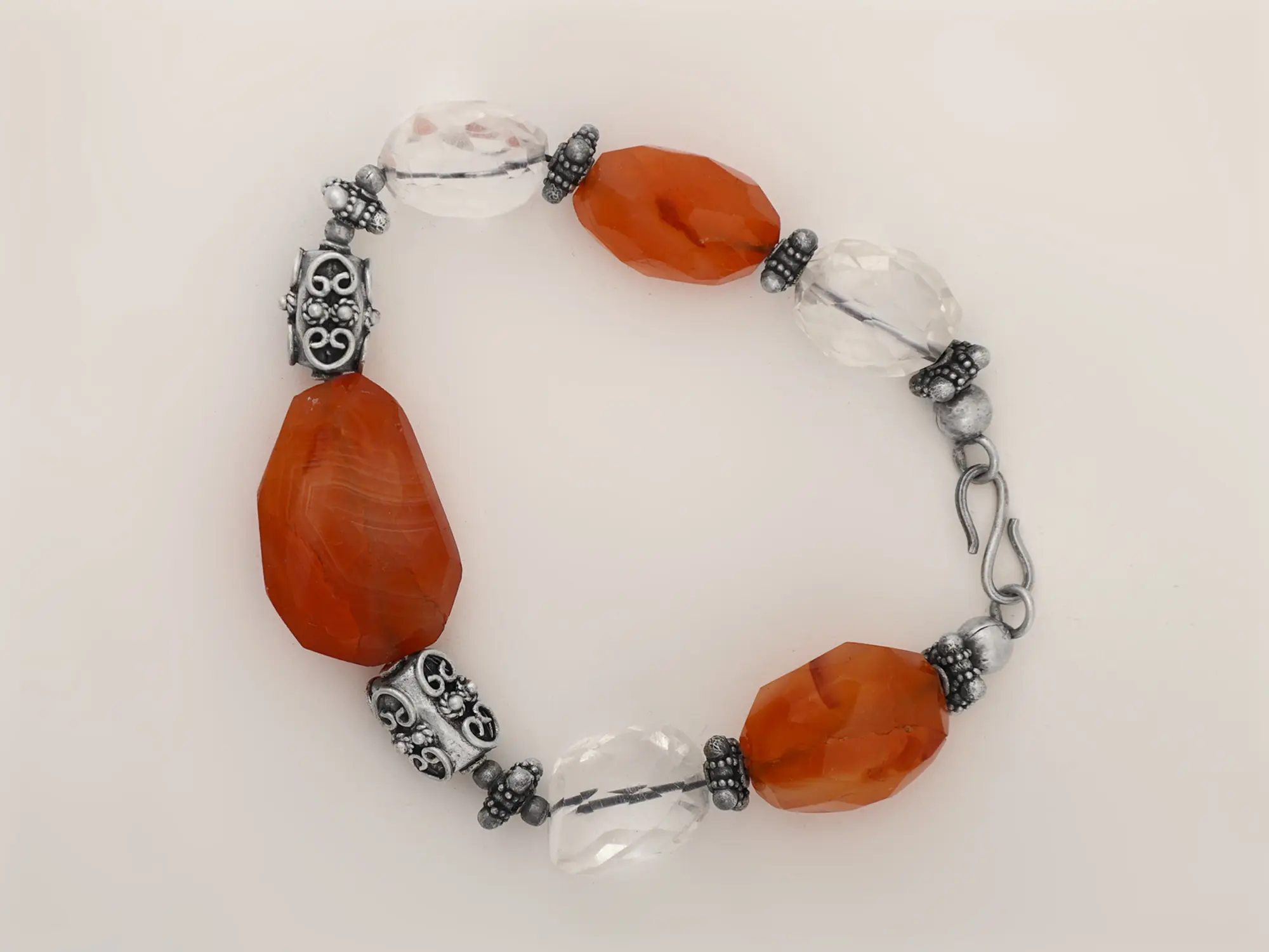 Illuminate your wrist with this bracelet featuring a beautiful combination of crystals and carnelian gemstones. The bracelet’s intricate design showcases the brilliance of sparkling crystals and the warm hues of carnelian, creating a harmonious and eye-catching accessory.