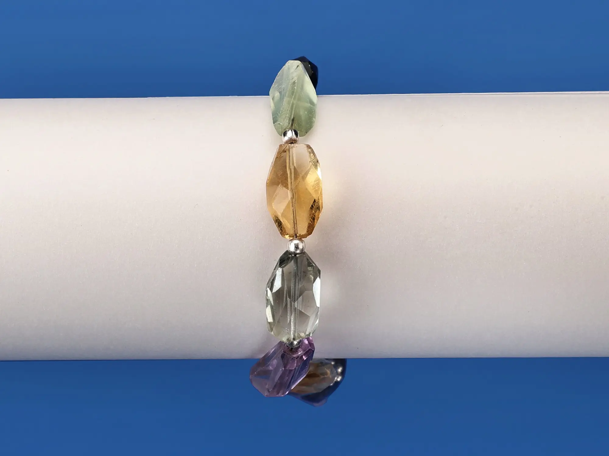 A gorgeous array of gemstone nuggets, each precisely faceted to showcase its inherent brilliance and sparkle, adorn this bracelet, which you may wear on your wrist with elegance and sophistication. This multifaceted nugget gemstone bracelet is the ideal accessory to add some color to any outfit. It will turn heads and end up being a treasured addition to your jewelry collection.