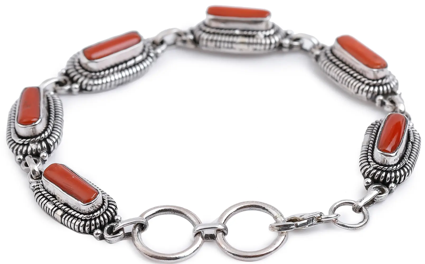 The artistry of this bracelet is evident in every detail. The coral cabochons are expertly shaped and nestled within intricately detailed sterling silver bezels. These bezels are further enhanced with a delicate rope-like texture, adding depth and dimension that catches the light beautifully. The individual links are substantial yet designed for comfortable movement, allowing the bracelet to drape gracefully around your wrist. Connecting these stunning elements is a sturdy yet elegant sterling silver chain, culminating in a secure clasp that ensures your precious adornment stays perfectly in place. –––––––––––––––––––