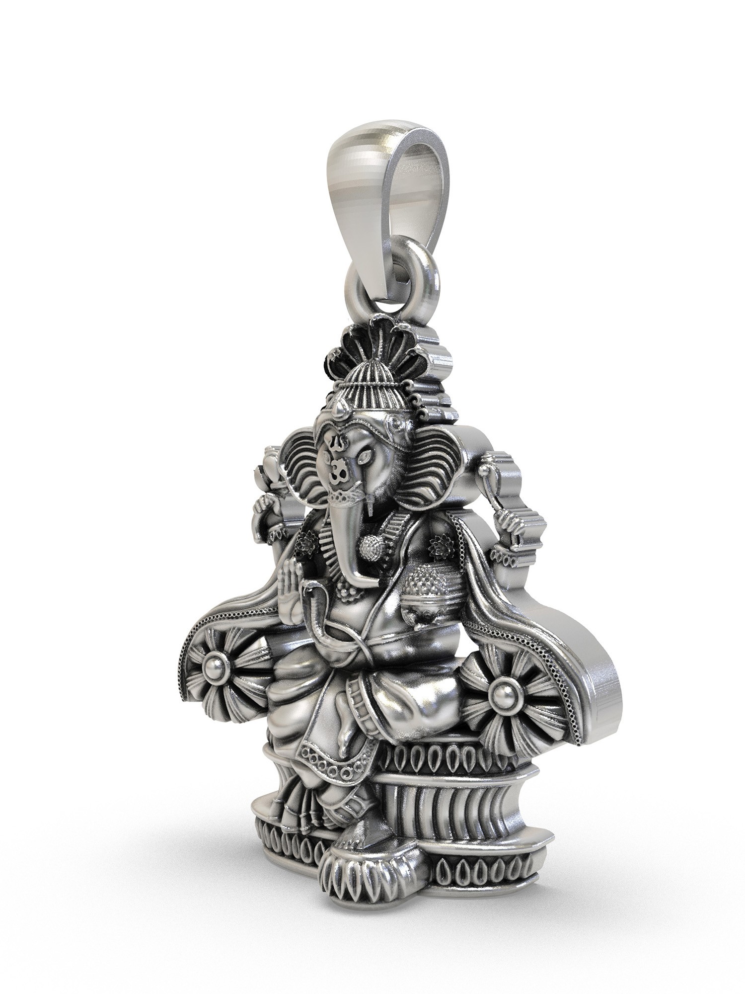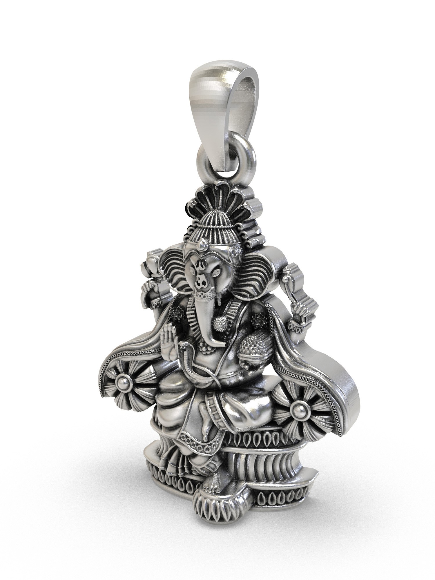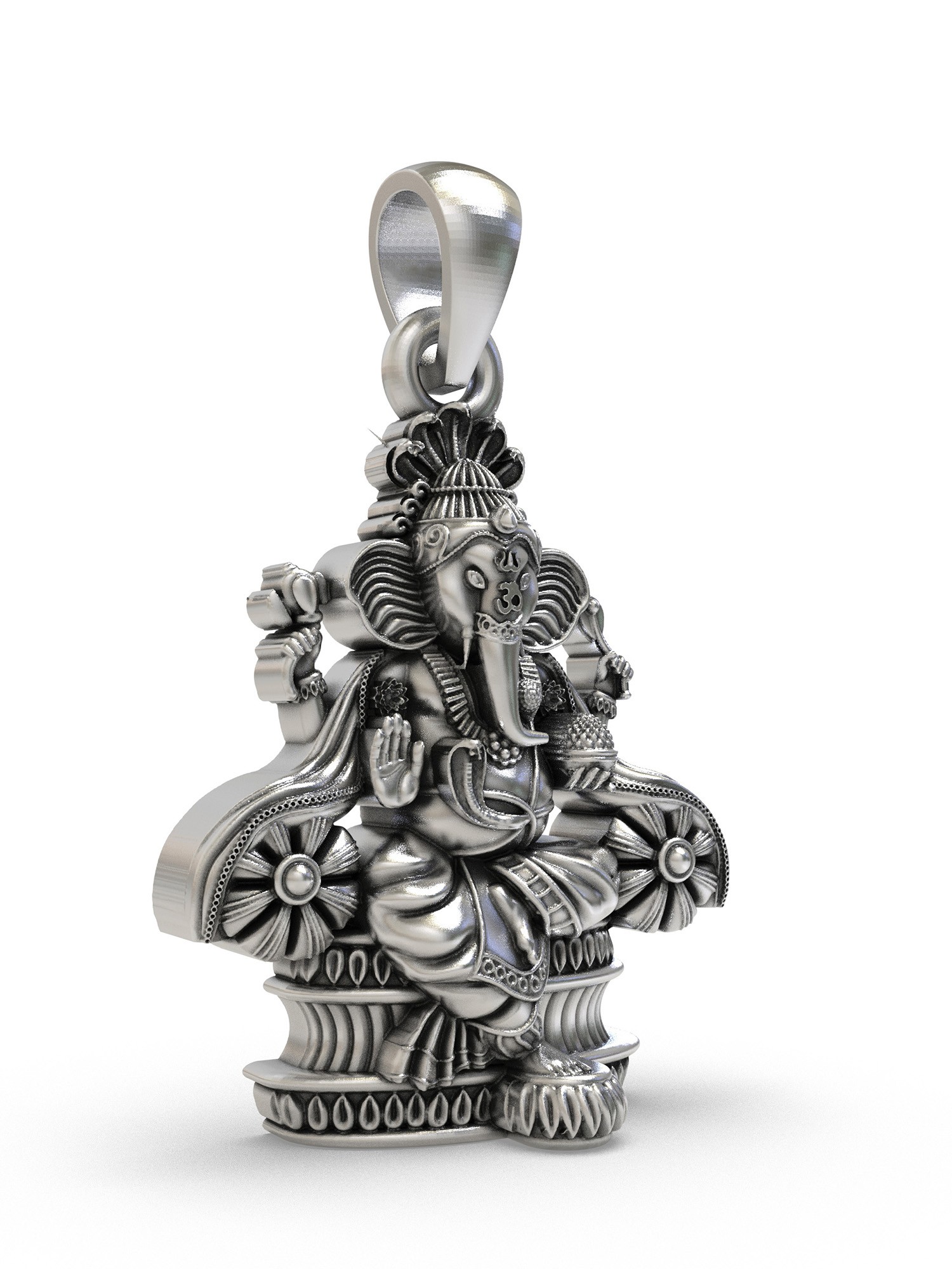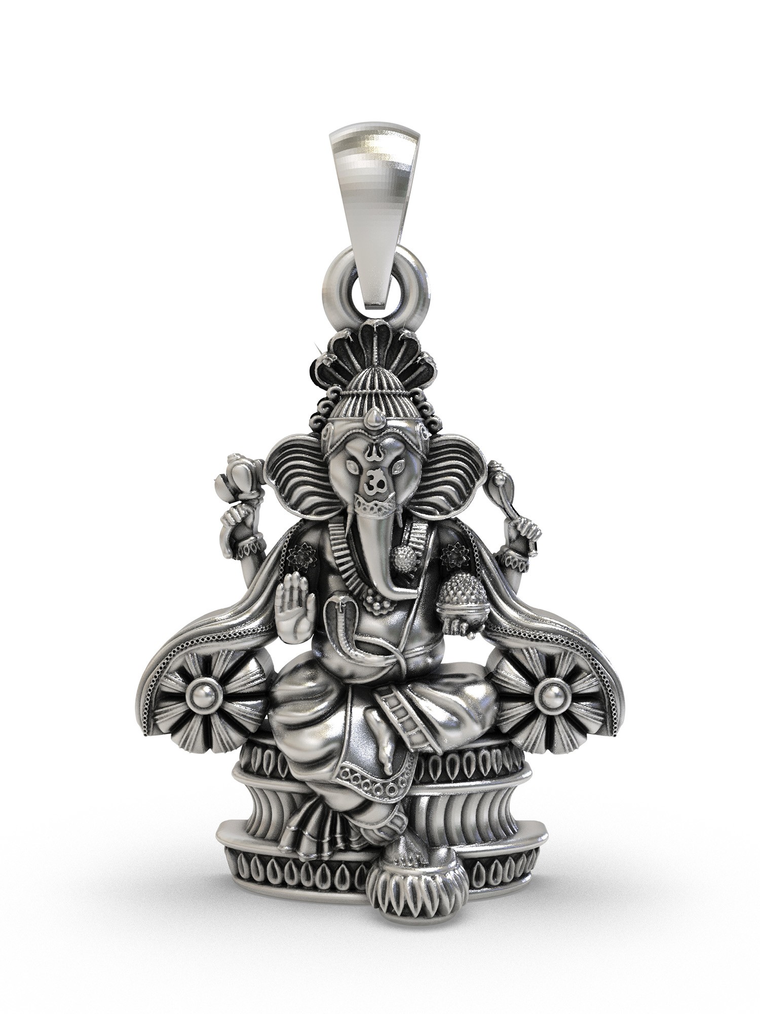 Invite blessings and prosperity into your life with this intricately crafted pendant. Representing the revered Hindu deity, Lord Ganesha, this piece is a testament to artistry and spiritual significance. Ganesha, known as the remover of obstacles and the god of new beginnings, is depicted here with four arms, each holding symbolic objects that represent his power and wisdom. The detailed carving showcases the craftsmanship, rendering a striking image of Ganesha seated upon a lotus pedestal. The lotus, a symbol of purity, enlightenment, and rebirth, adds depth to the piece's overall meaning. The pendant's design captures the divine essence, making it more than just an accessory; it's a statement of faith and a source of daily inspiration.