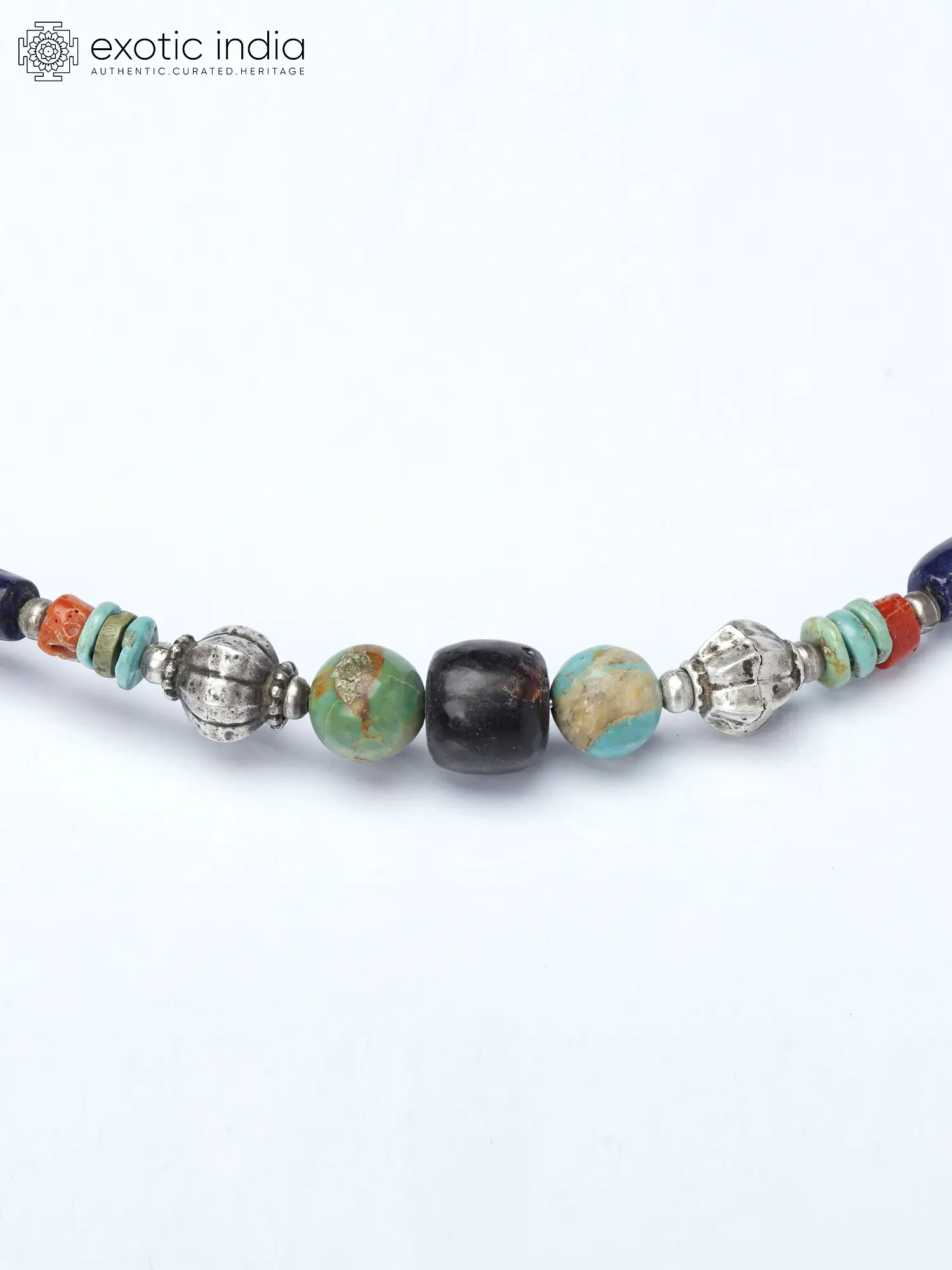 The focal point of this exquisite necklace is the carefully curated selection of multi-colored stones. A mesmerizing medley of lapis lazuli, turquoise, coral, and other semi-precious gems are strung together. Each stone possesses its own unique texture and tone, creating a dynamic and eye-catching composition. The differing shapes and sizes of the beads add to the necklace's distinctive charm, making it a true conversation starter. Intricate silver beads are also incorporated into the arrangement, adding a touch of rustic charm and depth to the design.