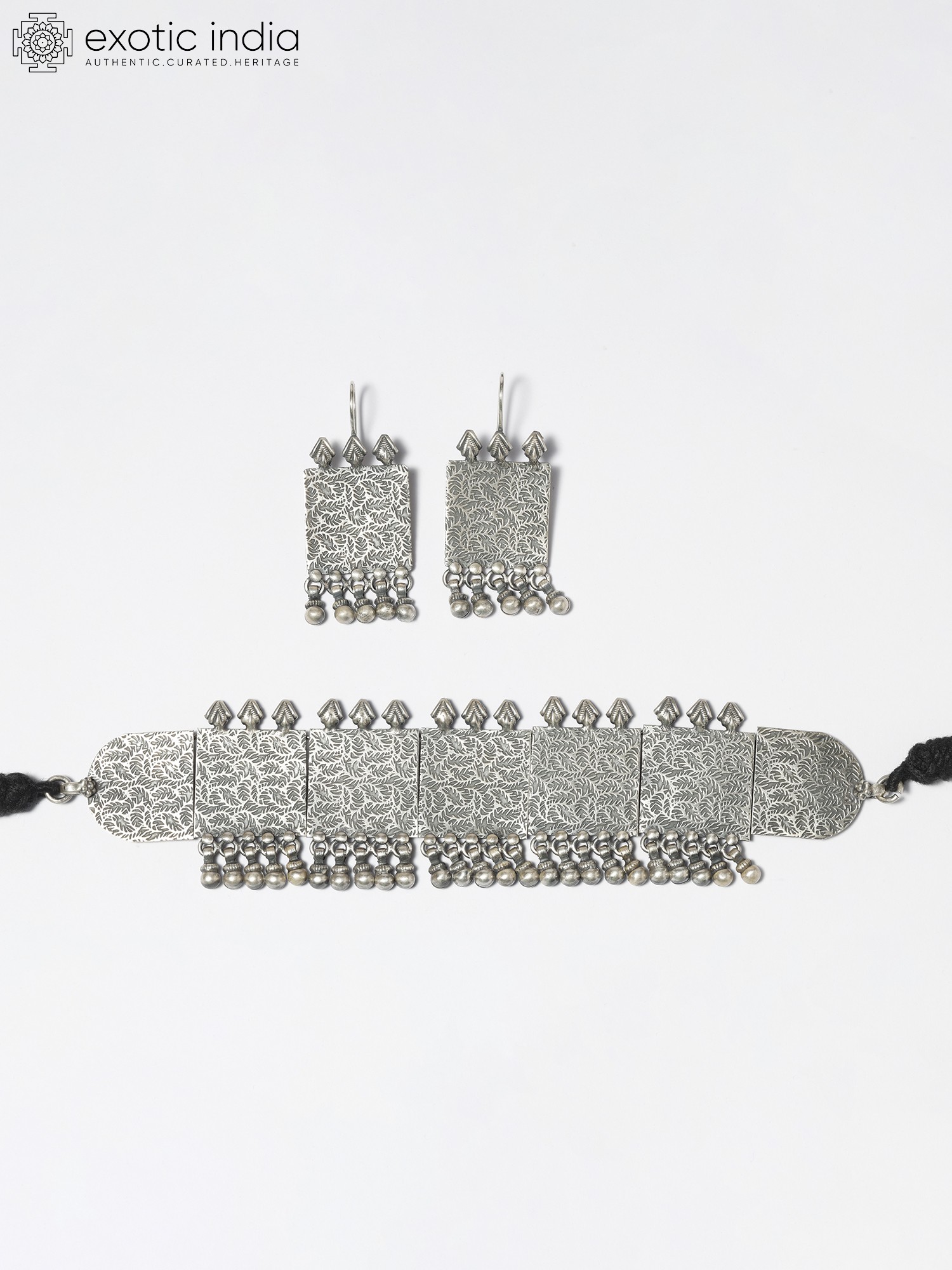 The choker boasts a captivating design, comprising of repeating square motifs. These square segments are interconnected and feature intricate, etched detailing. Hanging delicately from these squares is a fringe of tiny silver spheres. The earrings mirror this design, creating a coordinated and sophisticated look. They feature the same patterned square as the choker with similar dangles.