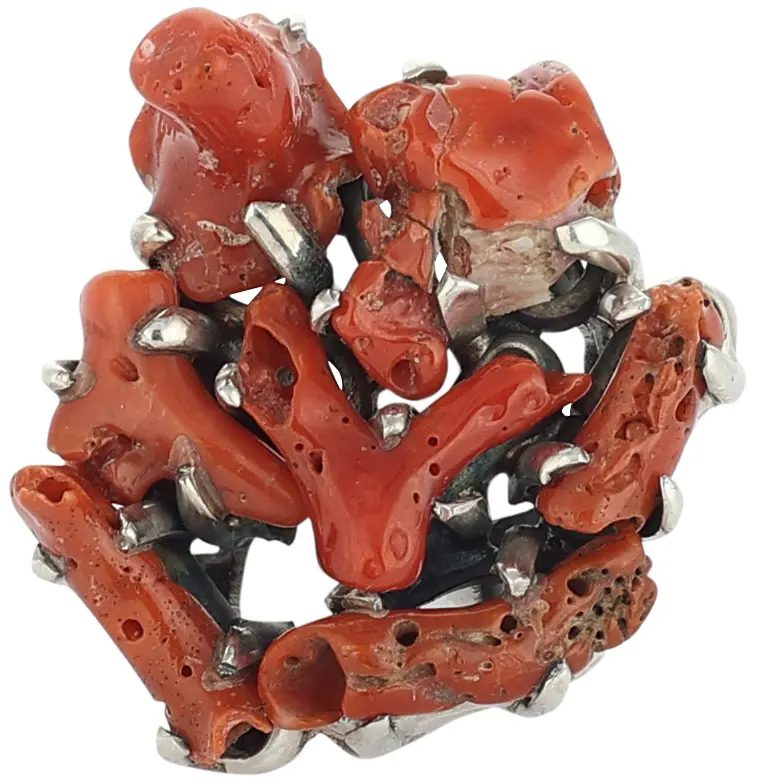 Adjustable Sterling Silver Peacock Ring with Coral