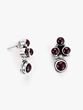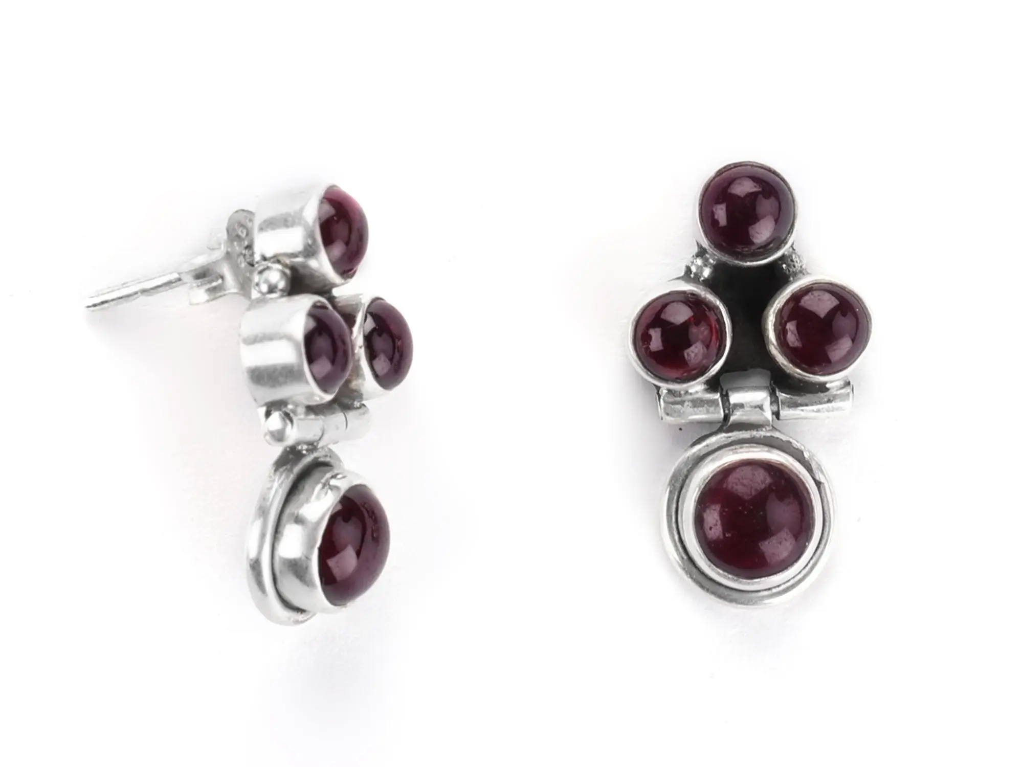 Features a cluster of three round garnet gemstones atop a larger faceted garnet drop.