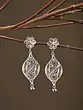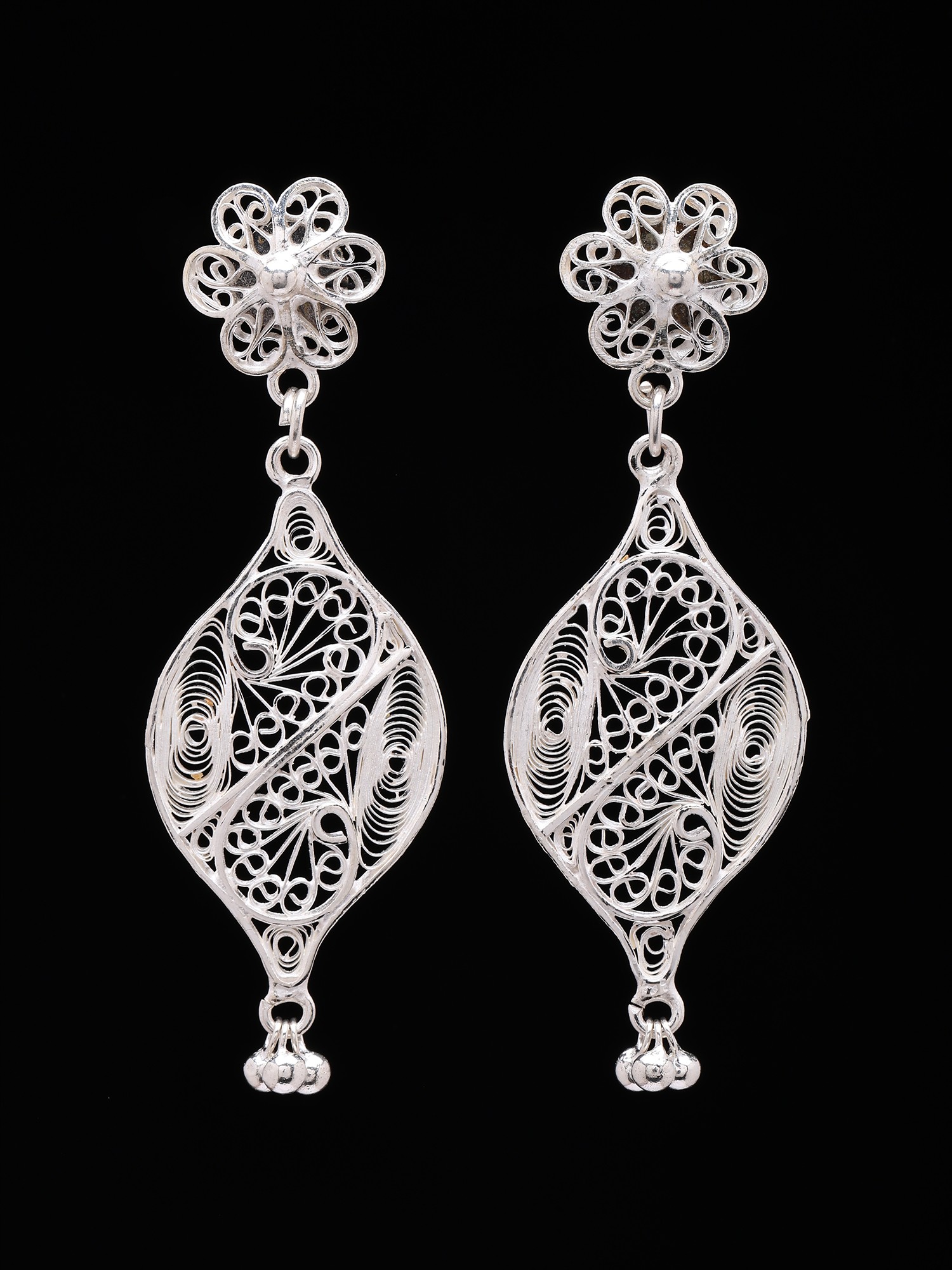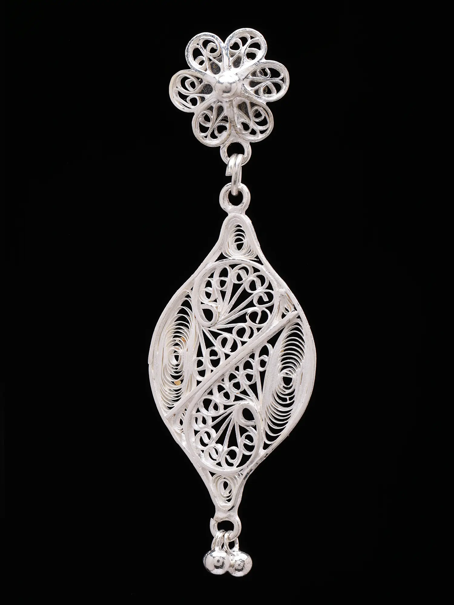 The design begins with a charming floral motif, each petal intricately rendered, leading to a stunning teardrop-shaped pendant. This central element showcases a mesmerizing lattice of filigree, creating an illusion of ethereal lightness. At its base, a pair of delicate ghungroo bells add a subtle, delightful chime with every movement. Measuring approximately 2.35 inches in height and 0.75 inches in width, they strike a perfect balance between understated elegance and noticeable grace.