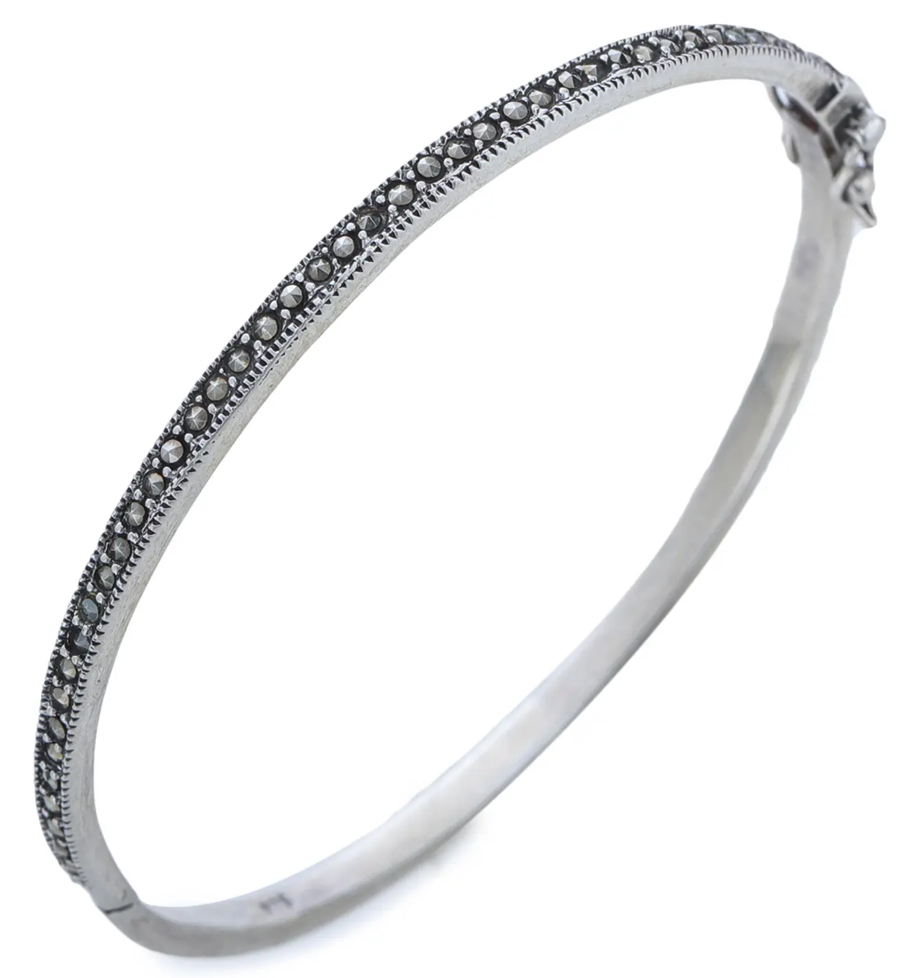 The captivating sparkle of marcasite adds a touch of subtle glamour. Each stone, meticulously set, catches the light with a unique, almost antique gleam. The precisely arranged stones create a stunning contrast against the cool, bright sterling silver, forming a band of captivating visual texture. Marcasite, with its pyrite base, offers a rich metallic luster that perfectly complements the classic silver finish. It provides a beautiful sparkle without the high expense of diamonds. The stones offer a subtle gleam that is sure to capture attention in any setting.