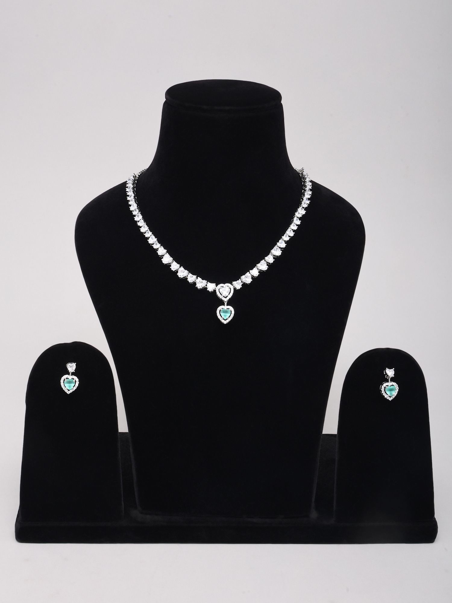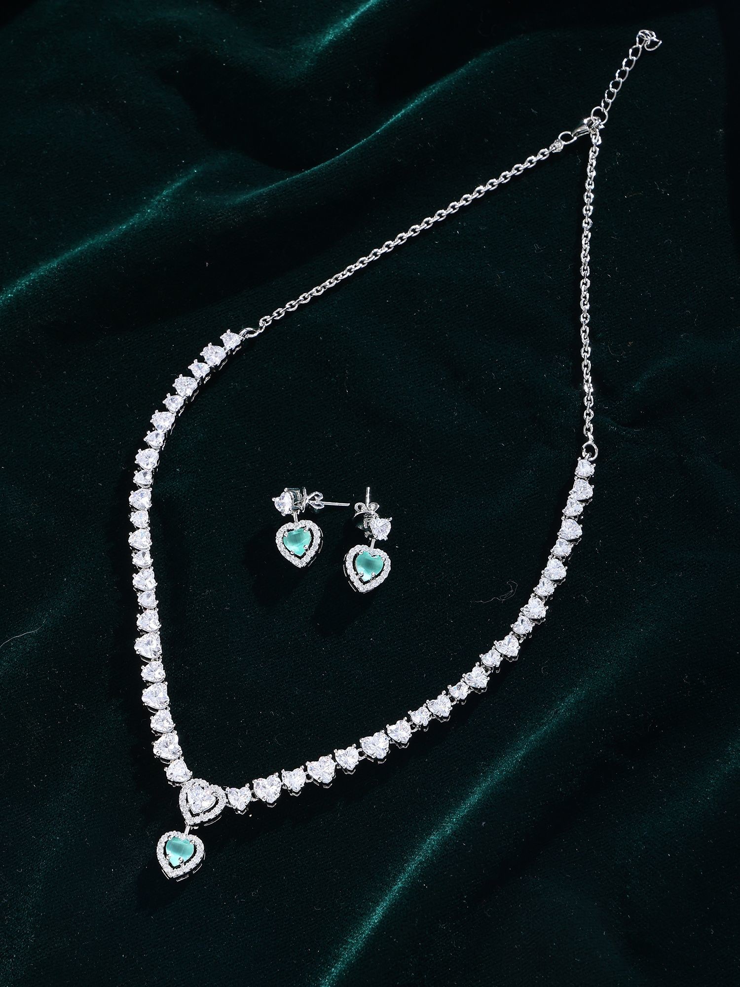 The central pendant showcases a captivating heart-cut green zircon.
