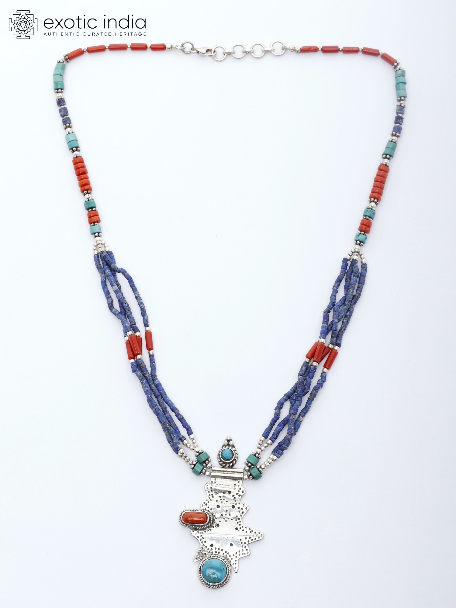 This exquisite sterling silver necklace is a captivating blend of traditional craftsmanship and vibrant gemstones. Its design is inspired by the rich cultural heritage of India, reflecting a deep appreciation for artistry and natural beauty. The necklace features a stunning array of auspicious turquoise, coral, and lapis lazuli beads, meticulously strung together to create a mesmerizing cascade of color. Each bead is carefully selected for its quality and unique character, ensuring that this necklace is a truly one-of-a-kind piece.