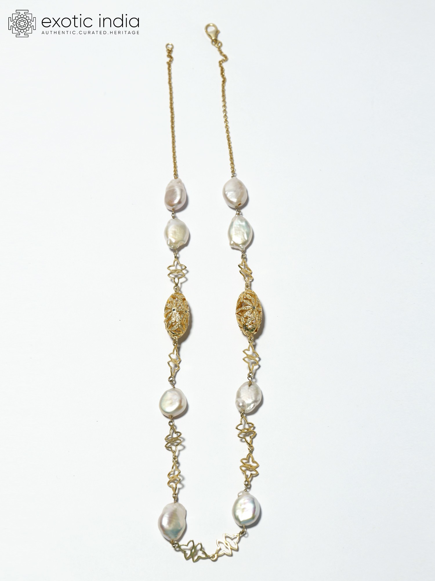 This exquisite necklace is a testament to timeless elegance, seamlessly blending the lustrous beauty of natural pearls with the sophistication of sterling silver. Each unshaped pearl is unique, showcasing the organic beauty of nature. Their soft, creamy tones dance with the light, creating a captivating shimmer that elevates any outfit. The pearls are thoughtfully interspersed with delicate gold-plated sterling silver accents, creating a visually stunning contrast. These intricate gold-toned filigree elements add a touch of modern flair to this classic design, ensuring this necklace remains a cherished piece for years to come. The necklace hangs at a versatile 10.5 inches, making it perfect for layering or wearing solo.
