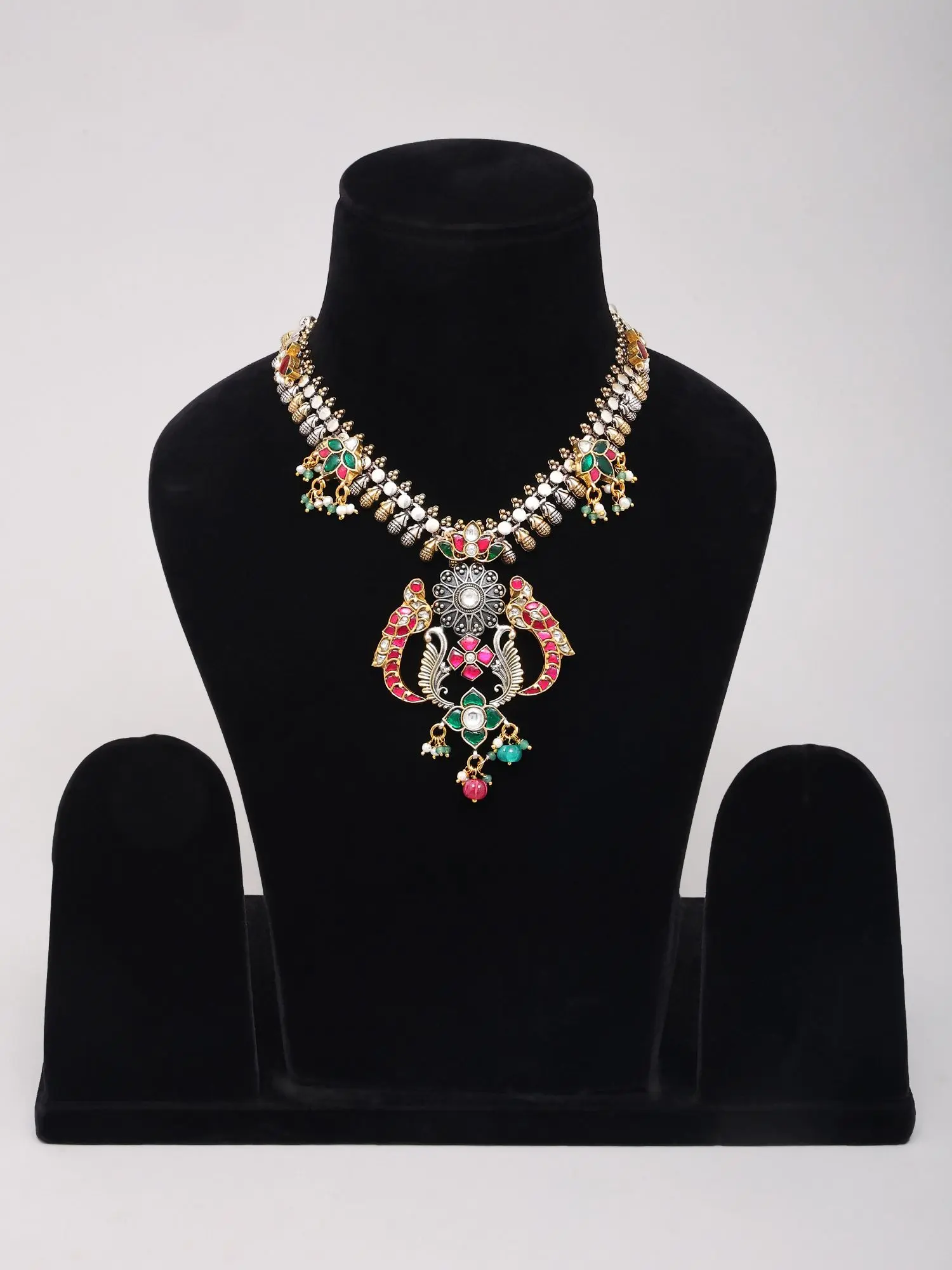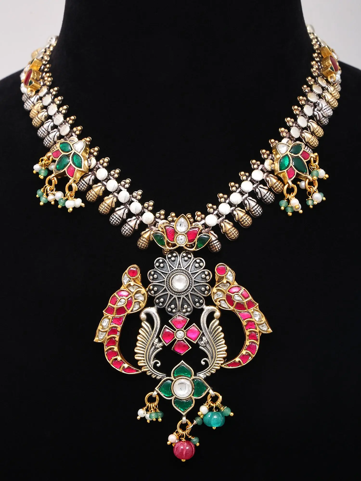 The centerpiece is a captivating peacock motif, rendered with astonishing lifelikeness, its form adorned with rich, jewel-toned Kundan stones and accented with small, shimmering pearls. This central masterpiece is embraced by a gracefully articulated chain, approximately 10 inches in length, that can be easily adjusted for your perfect fit. The striking pendant itself measures an impressive 3 inches in length and 2.1 inches in width, ensuring it commands presence without overwhelming.