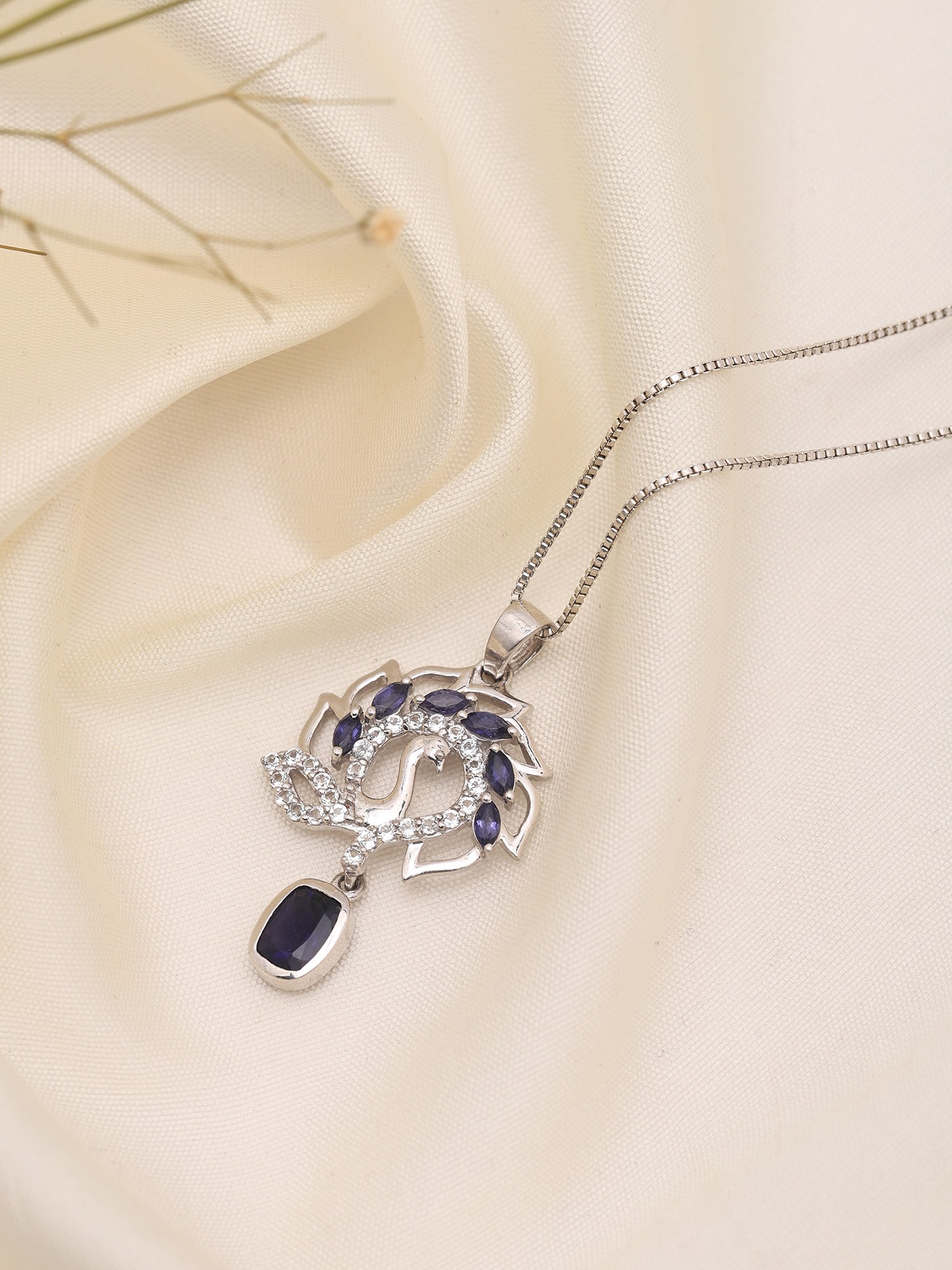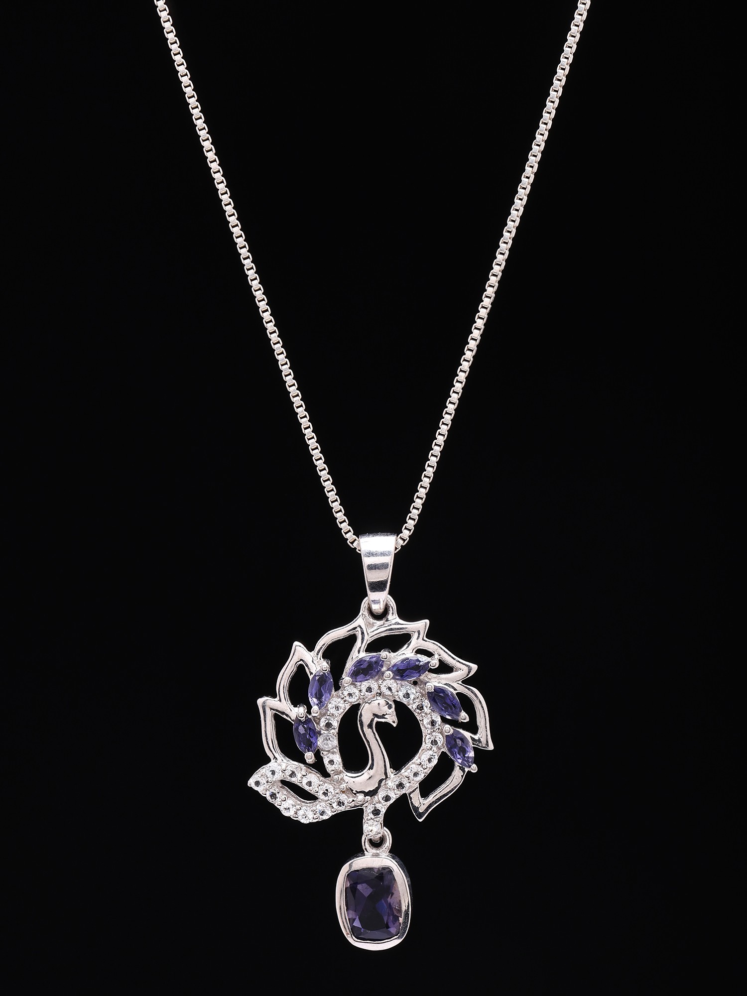 Features a meticulously crafted sterling silver pendant in a striking peacock design.