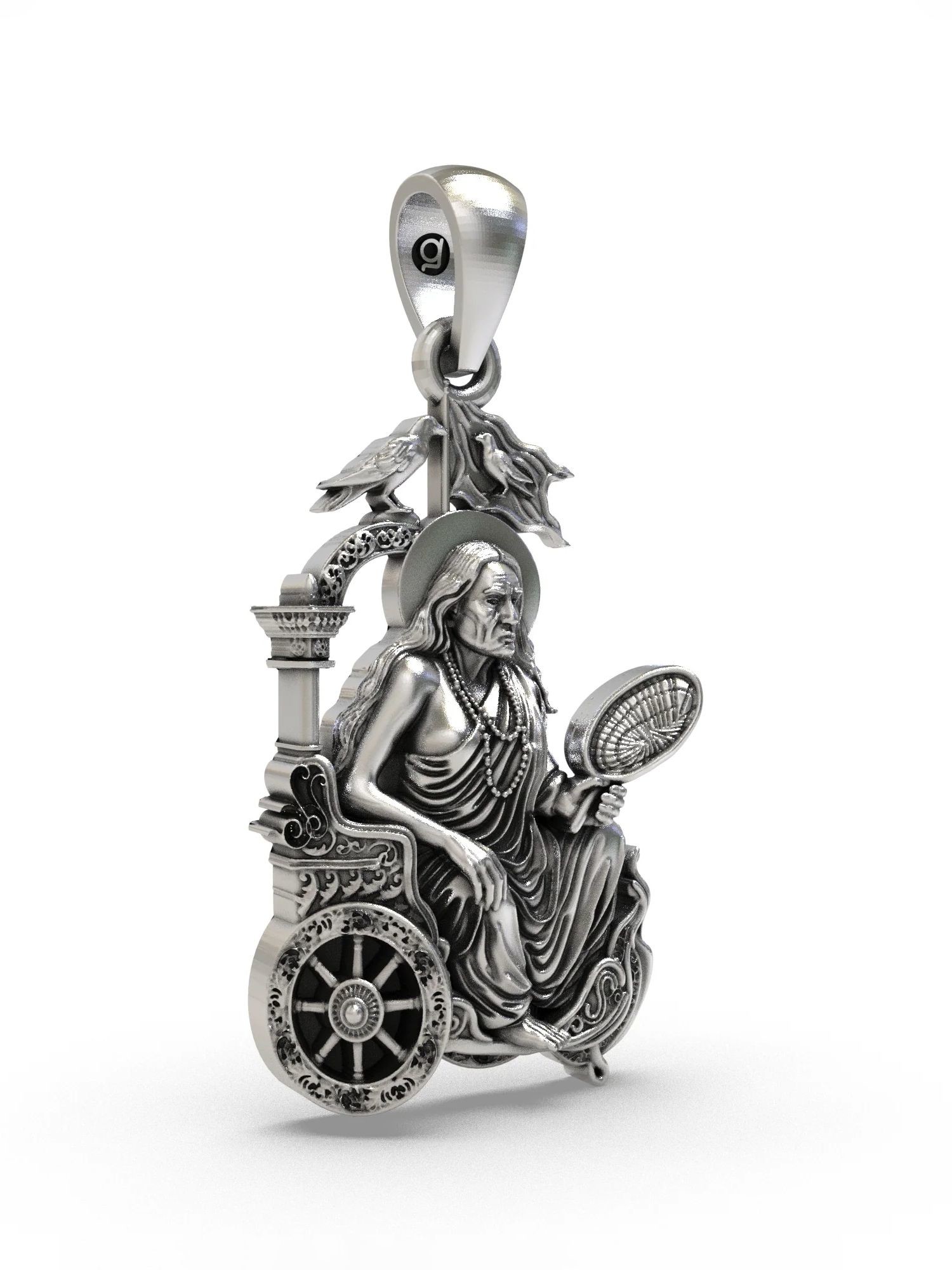 Measuring a graceful 1.15 inches in height and 0.50 inches in width, this pendant presents a perfectly balanced silhouette. You'll appreciate the rich texture and depth achieved through meticulous sculpting, bringing the seated figure to life. The symbolic elements, including the crow and the auspicious banner, are rendered with striking clarity, enhancing its visual appeal and narrative depth.