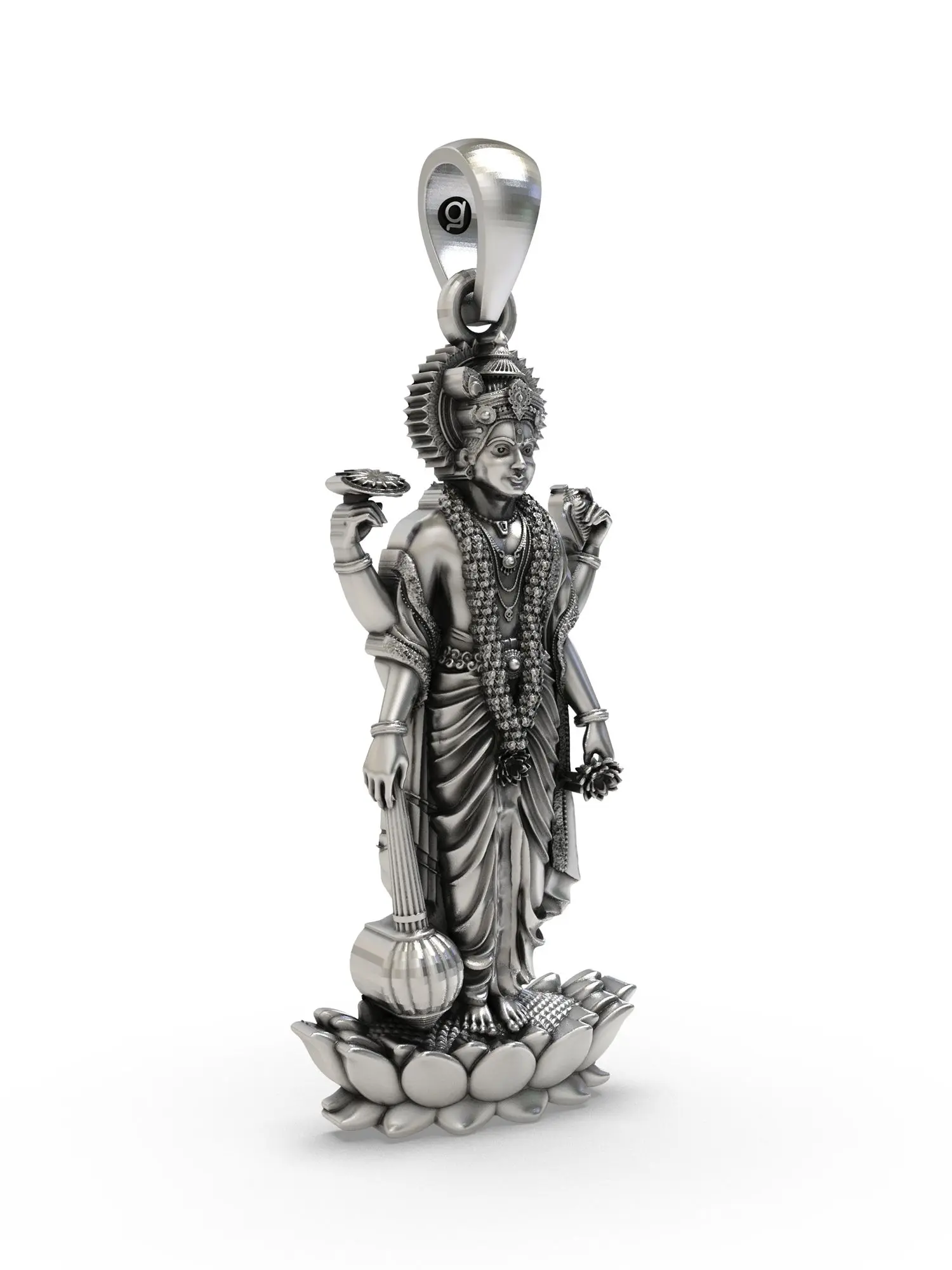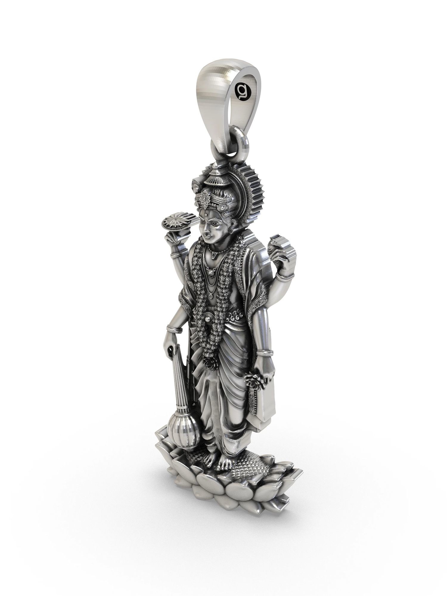 Pendant depicts Lord Vishnu, the preserver deity, in a commanding stance.