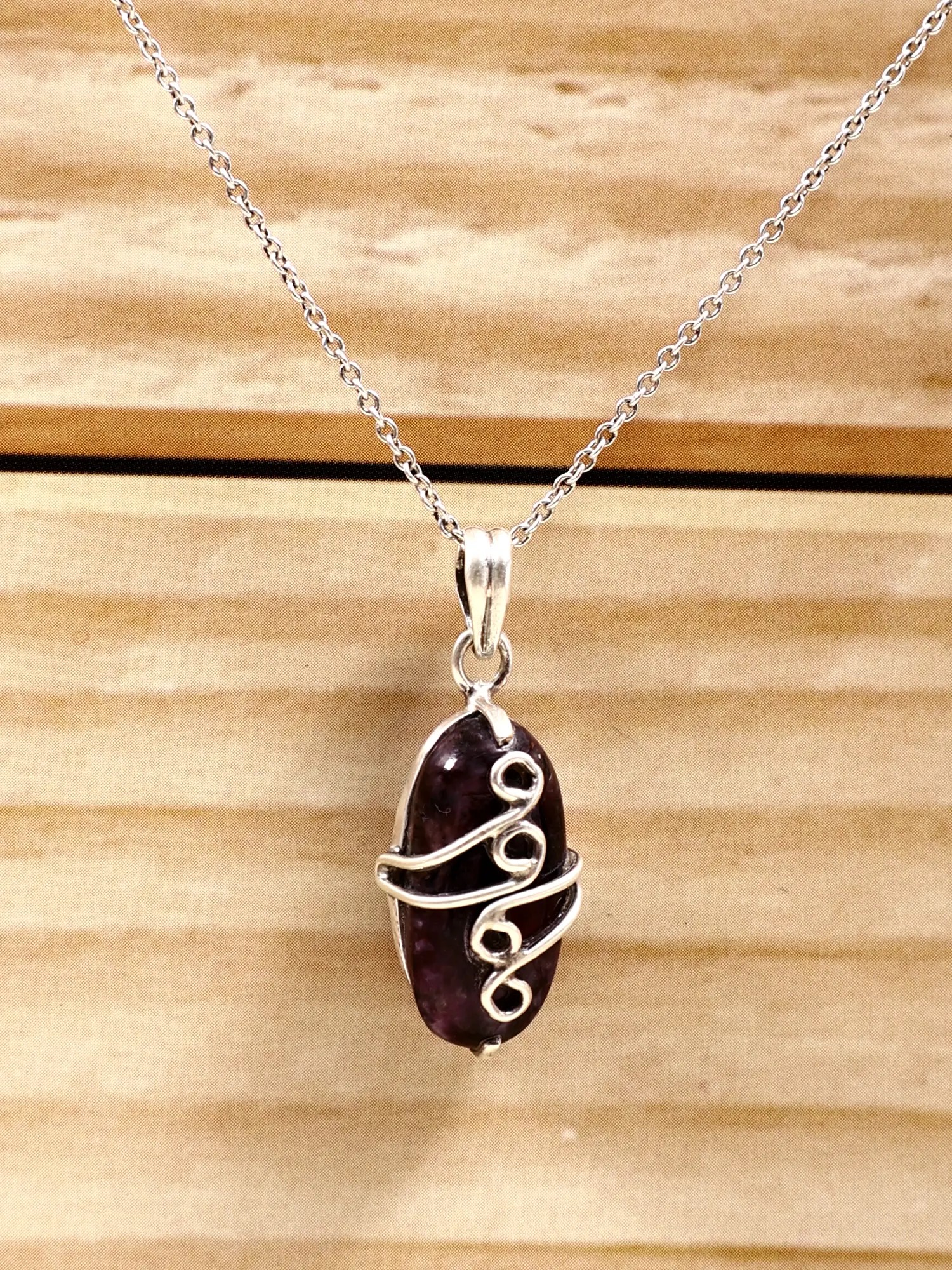 This exquisite pendant is a captivating blend of natural beauty and refined craftsmanship. The centerpiece is a stunning oval-shaped purple chlorite stone, its deep, rich hue mesmerizing and captivating. The stone’s natural variations in color and texture lend a unique character to each pendant, making it a truly one-of-a-kind piece. Handcrafted with meticulous attention to detail, the sterling silver setting elegantly complements the stone, enhancing its natural radiance. Delicate silver wire artfully wraps around the chlorite, adding a touch of modern flair to this timeless design.
