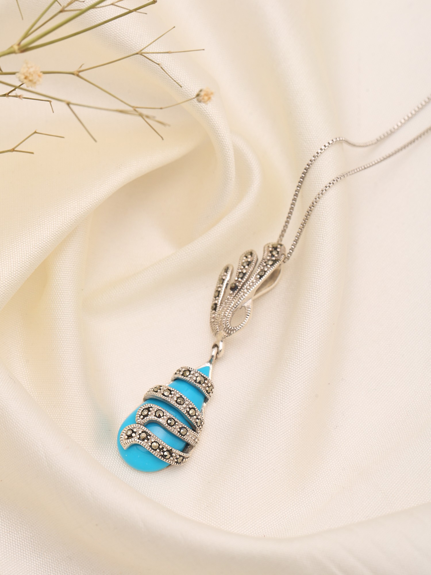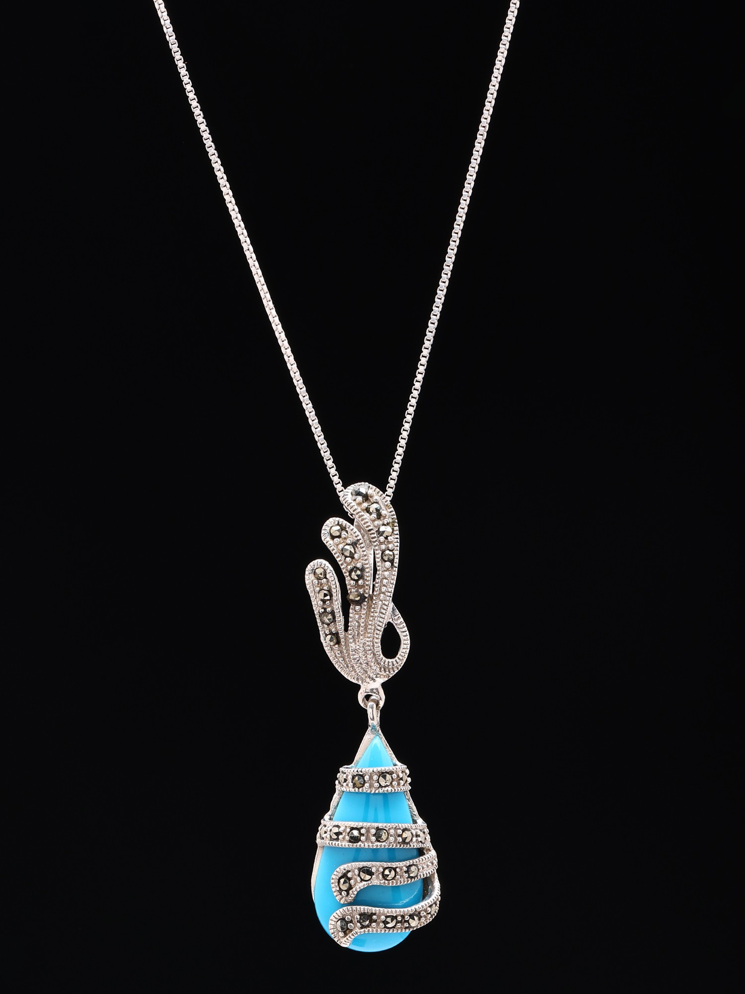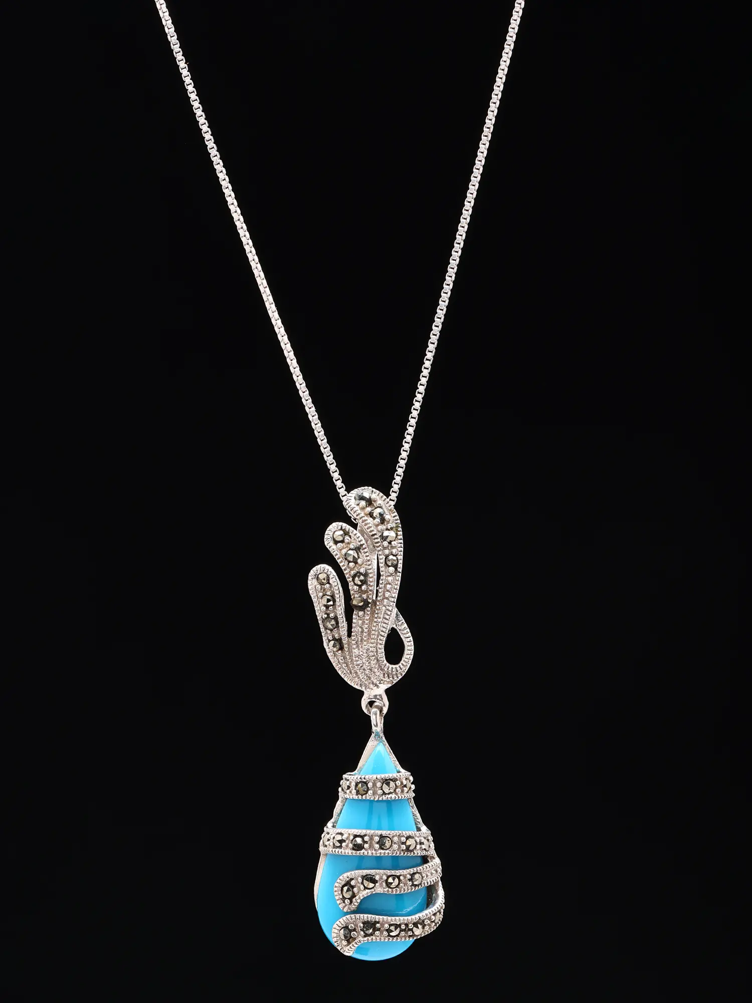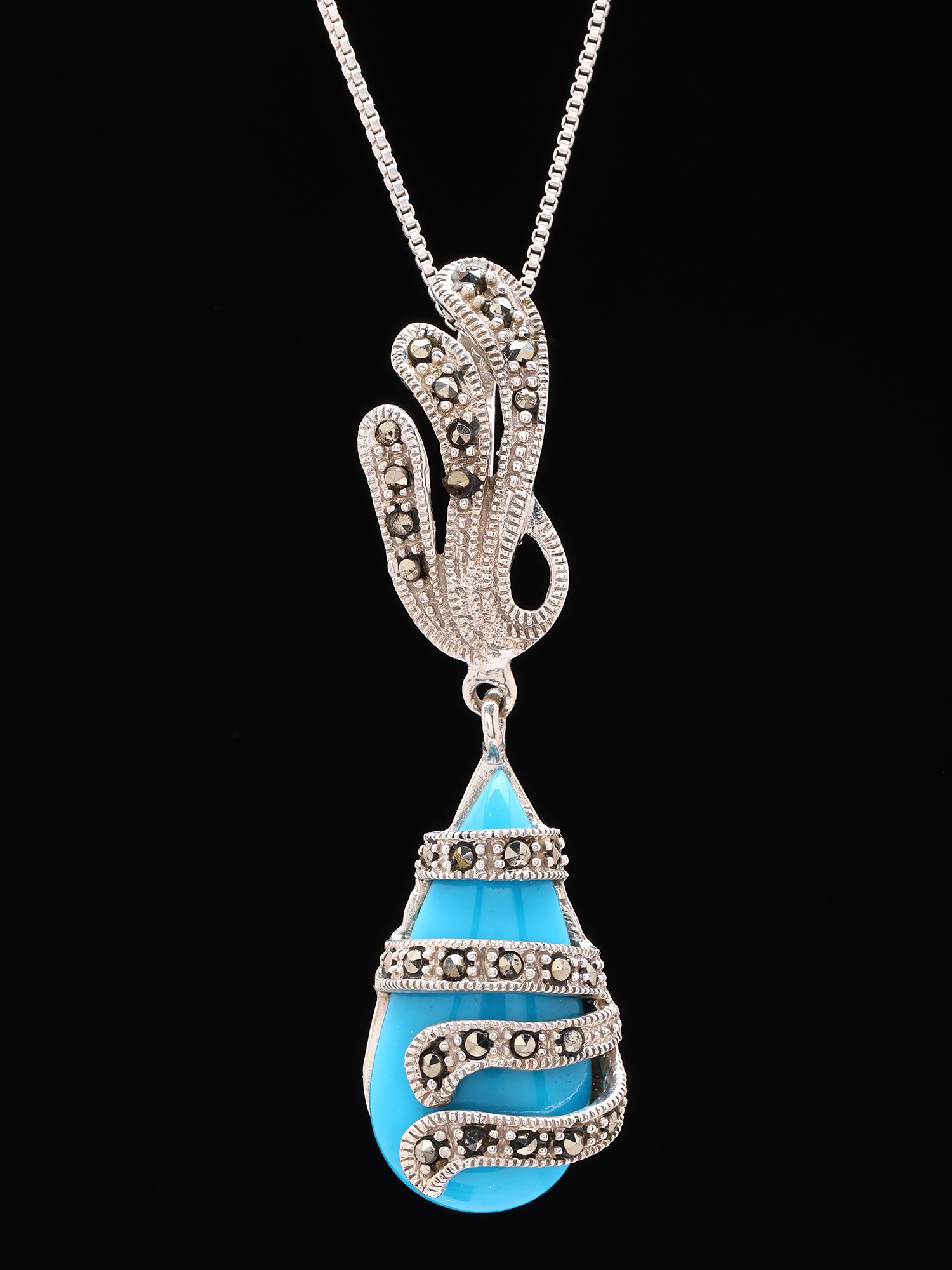 The pendant gracefully dangles, measuring approximately 2.05 inches in height and 0.5 inches in width, creating a perfectly balanced and eye-catching focal point. The fluidity of the sterling silver design, reminiscent of swirling vines, embraces the captivating teardrop turquoise, while the scattered marcasite stones catch the light with every movement. This harmonious interplay of textures and sparkle ensures a sophisticated and unforgettable aesthetic.