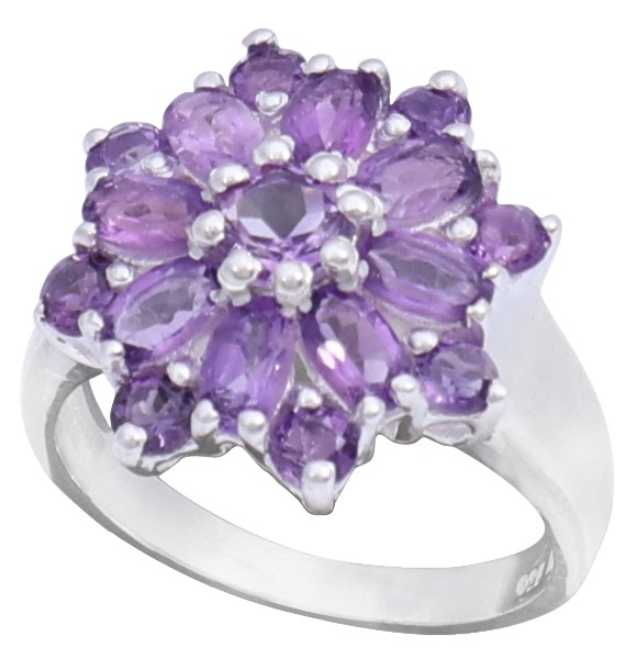 This stunning sterling silver ring features a breathtaking cluster of amethyst stones, artfully arranged to resemble a vibrant, blooming flower. The rich purple hues of the amethysts are captivating, radiating a sense of elegance and sophistication. The intricate detail of the setting enhances the natural beauty of the stones, making this ring a true masterpiece of craftsmanship. Perfect for adding a touch of regal charm to any outfit, this piece is certain to become a cherished addition to your jewelry collection. The meticulous attention to detail in both the design and the setting ensures a piece of exceptional quality and enduring style.