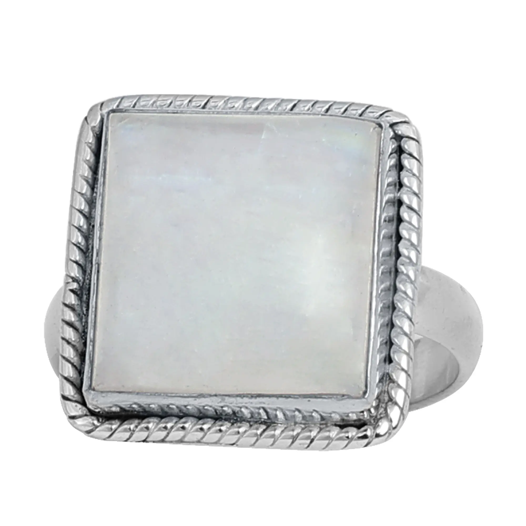 Adorn your hand with grace and enchantment in our sterling silver ring featuring a square rainbow moonstone. The square cut enhances the stone's captivating play of colors, creating a mesmerizing visual display. Beyond its aesthetic allure, Rainbow Moonstone is associated with intuition and balance. Wear this ring as a symbol of timeless elegance, seamlessly blending the sophistication of sterling silver with the mystical energy of the square Rainbow Moonstone, making a statement that resonates with both modern style and the enchanting beauty of nature.