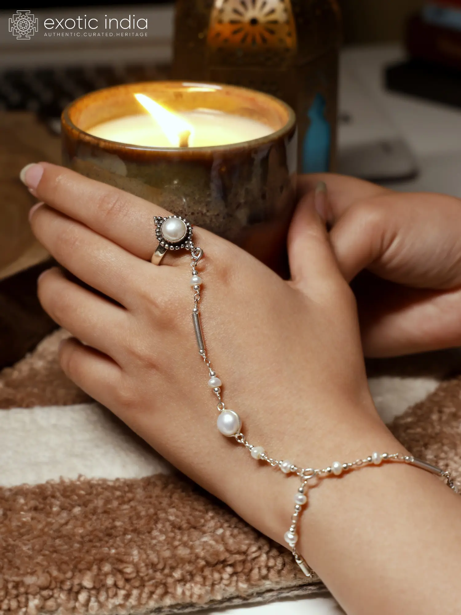 This exquisite piece is meticulously crafted from high-quality sterling silver. Sterling silver's radiant luster provides the perfect backdrop for the lustrous freshwater pearls incorporated throughout the design. The combination of the cool, modern silver and the organic, timeless beauty of pearls creates a harmonious balance. The focal point of the design is the ring, which features a single, perfectly round pearl set within a detailed sterling silver setting. The bracelet portion continues the theme of silver and pearl, with small, carefully placed pearls interspersed along the delicate silver chain. The silver chain showcases a link pattern with interspersed cylindrical silver accents that adds textural interest to the design.