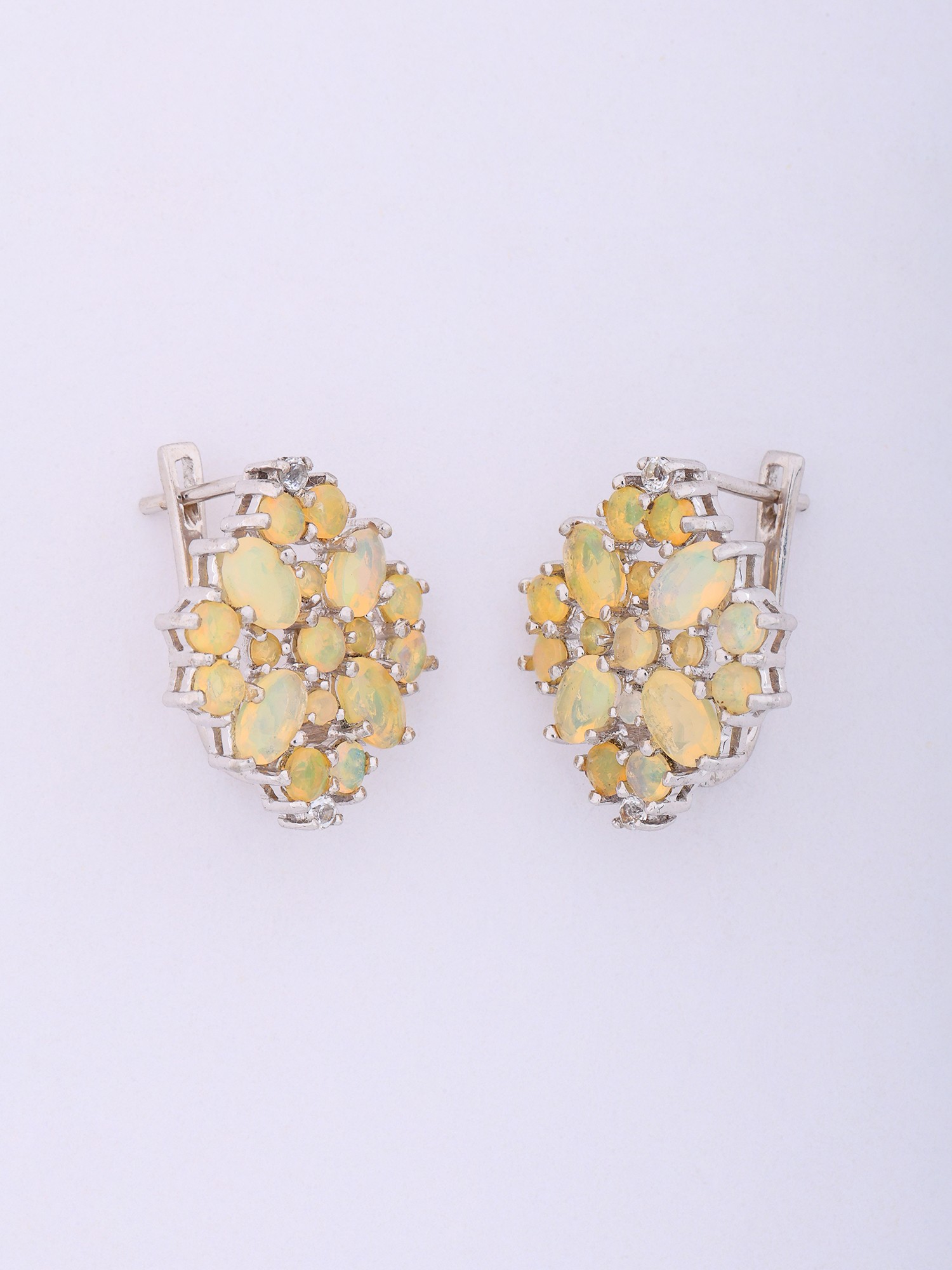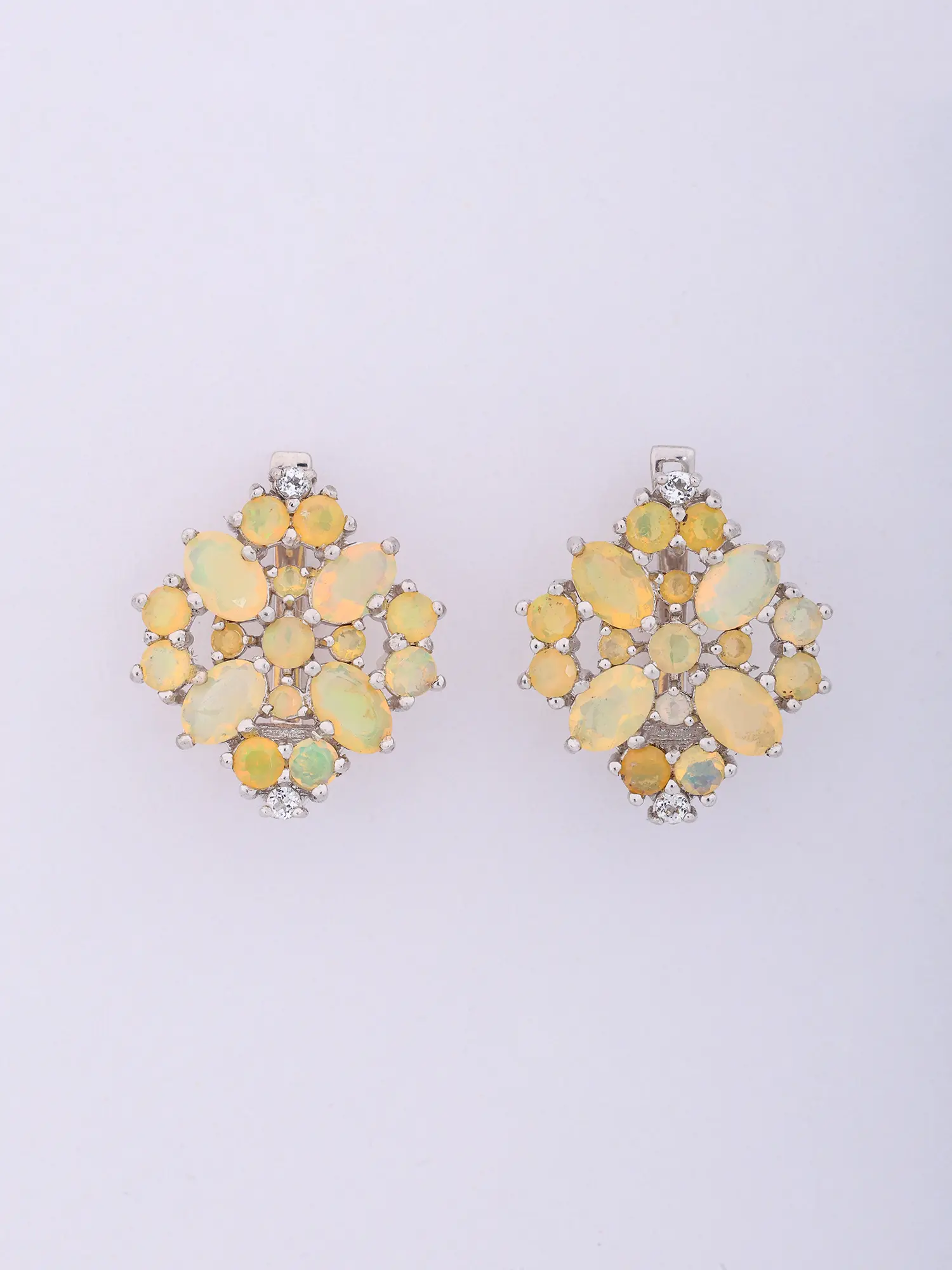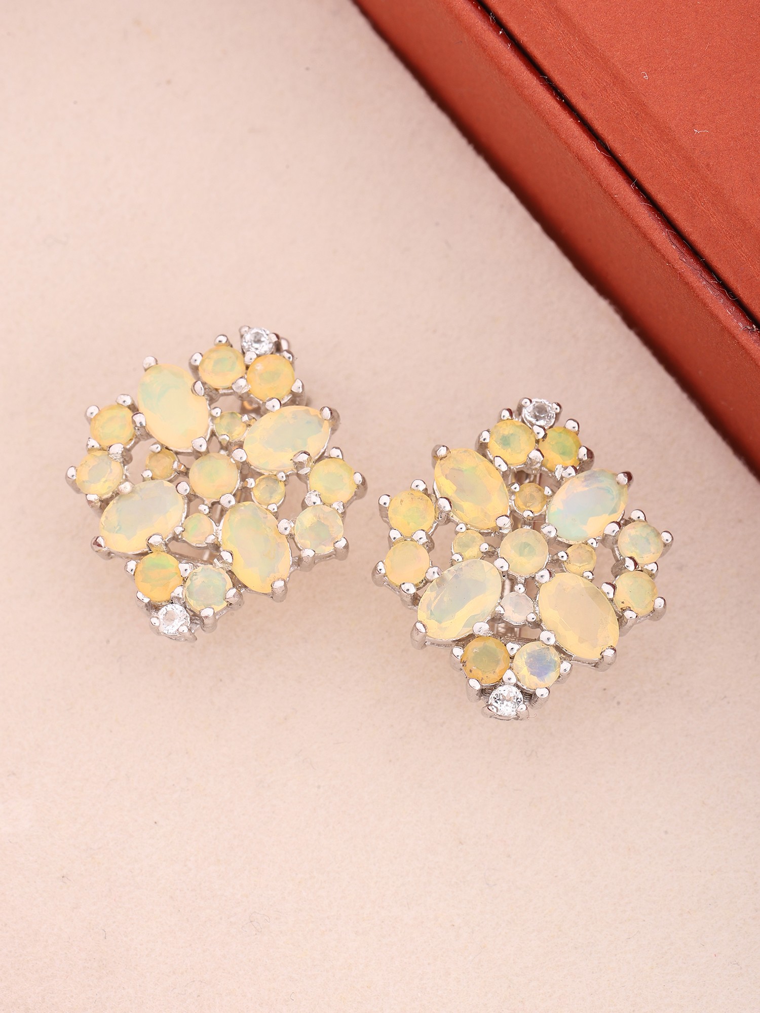These earrings feature a delicate cluster design, a symphony of oval and round-cut Ethiopian opals artfully arranged to create an organic, blooming effect. Accents of shimmering cubic zirconia add a subtle sparkle, enhancing the overall brilliance. Measuring approximately three-quarters of an inch in height and just under a third of an inch in width, their proportions offer a statement presence without overwhelming your features. You'll love how they frame your face with a sophisticated glow.