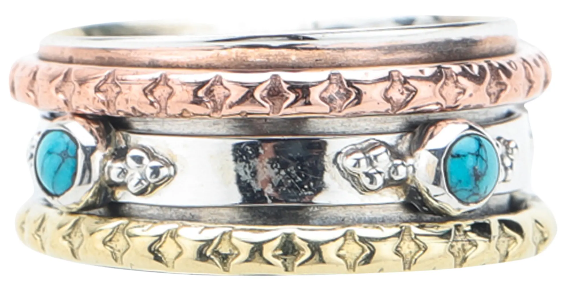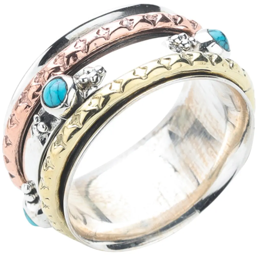 This stunning ring features a captivating blend of textures and colors. Made from sterling silver, the base of the ring is designed to be a durable and beautiful foundation. Three separate bands encircle the central ring, two of the rings have a star-like etching. Delicate, genuine turquoise stones are nestled onto the base, adding a touch of natural beauty and positive energy to the overall design. These stones are carefully chosen for their vibrant hue and unique character. The three-tone design, featuring the silver, copper, and brass tones, further enhances the ring's visual appeal. The contrast creates a stylish and eye-catching effect that complements any outfit.