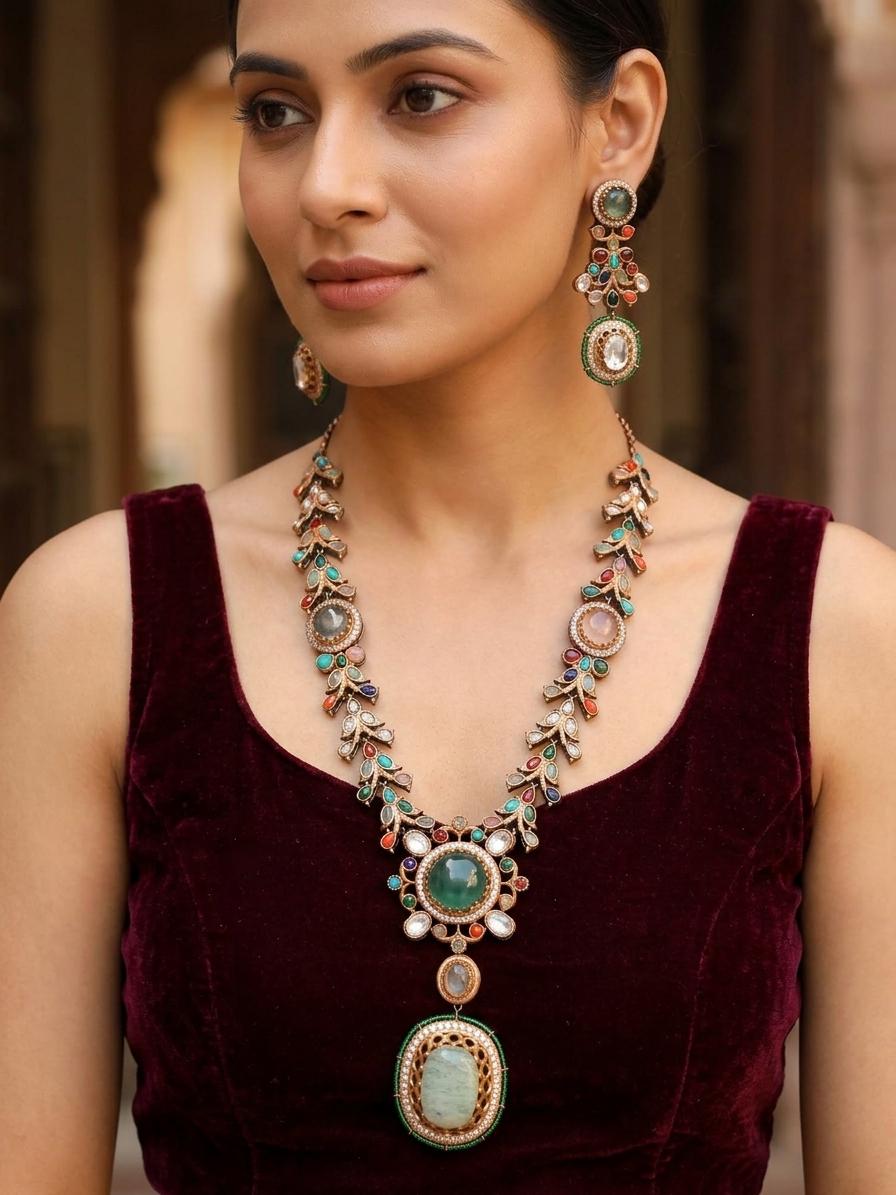 Victoria Polish Stone Studded Designer Necklace Set With Earrings