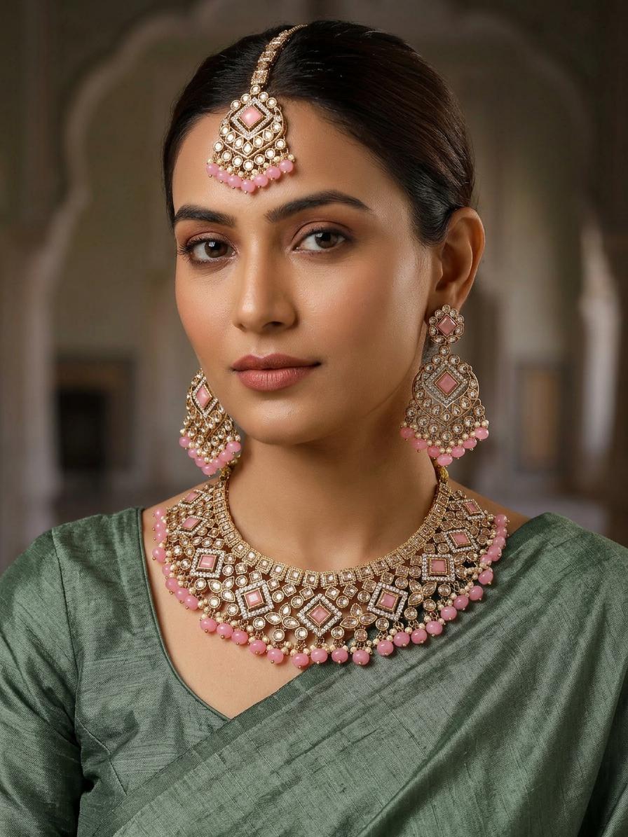 This exquisite necklace set is a breathtaking masterpiece, designed to add a touch of regal elegance to your special occasions. The intricate craftsmanship and dazzling stones create a truly unforgettable ensemble. This stunning set includes a statement necklace, a pair of matching earrings, and a delicate mangtika, all perfectly coordinated to elevate your look. The beautiful blush pink stones add a touch of soft color to the gold, creating a mesmerizing contrast that is both elegant and eye-catching.