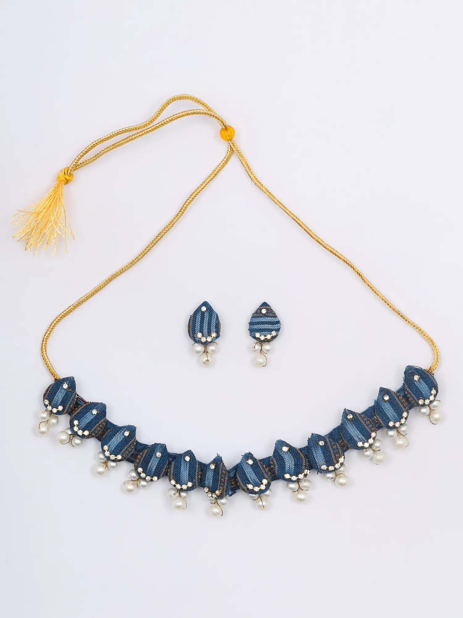 Elevate your style with this breathtaking choker necklace and earrings set, a true testament to handcrafted artistry. This piece seamlessly blends traditional Sambalpuri fabric with contemporary design, creating a unique and captivating accessory perfect for adding a touch of elegance to any occasion. The rich, deep blue of the Sambalpuri fabric is beautifully accented by delicate gold detailing and lustrous pearls, creating a mesmerizing play of textures and light. The handcrafted nature of this piece ensures each set is unique, a reflection of the rich cultural heritage of Sambalpuri weaving.