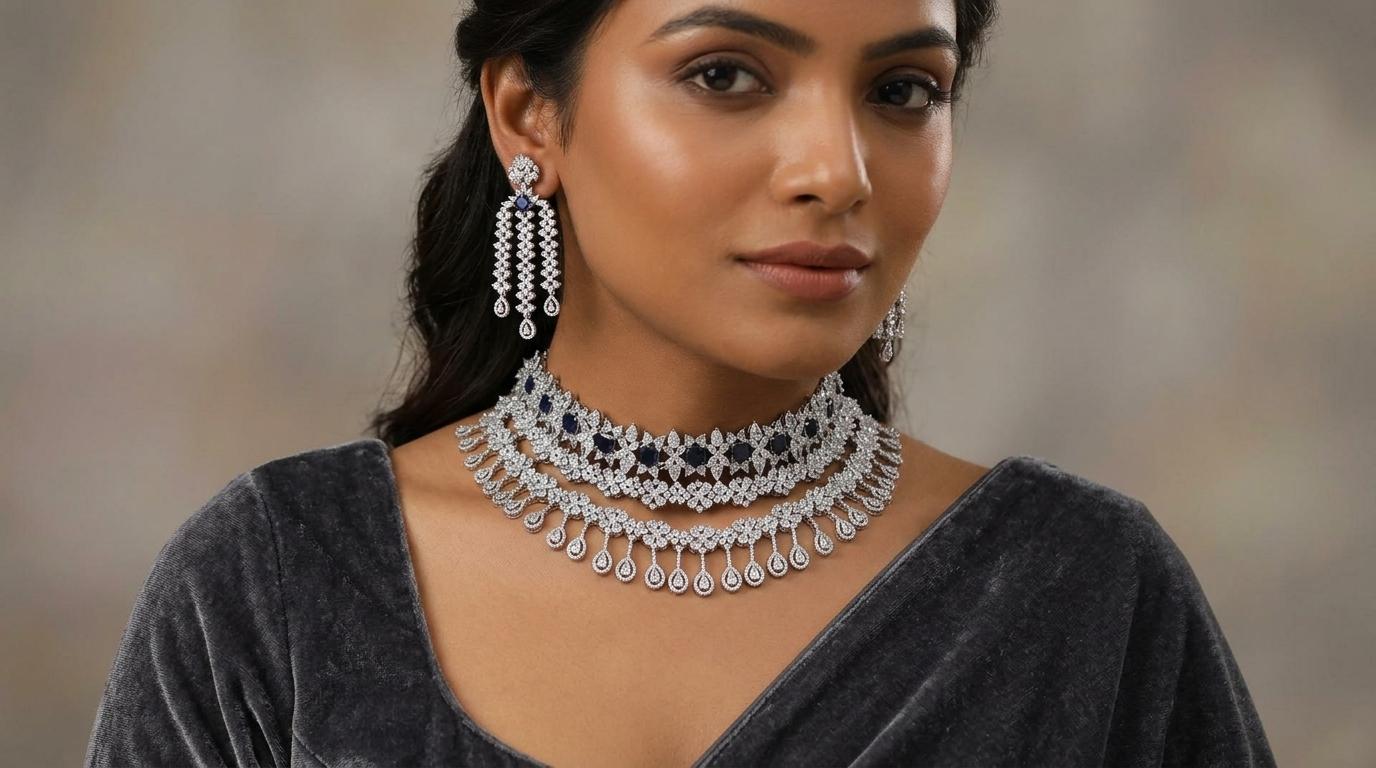 Elegant Double-Layered American Diamond Necklace Set And Matching Earrings