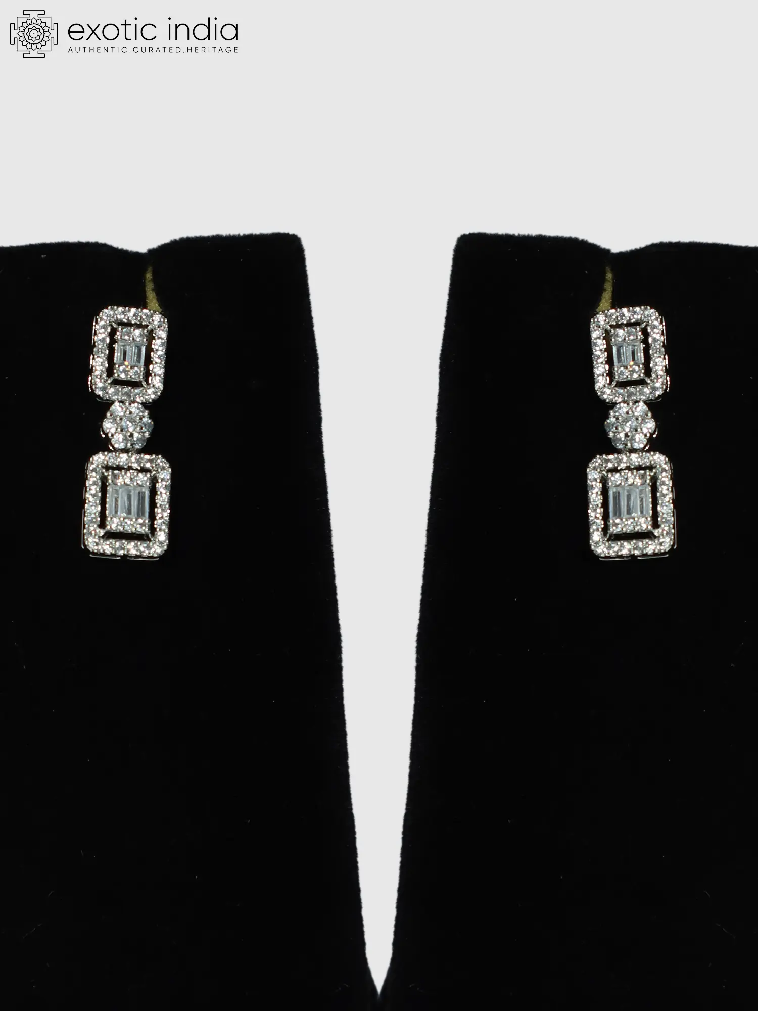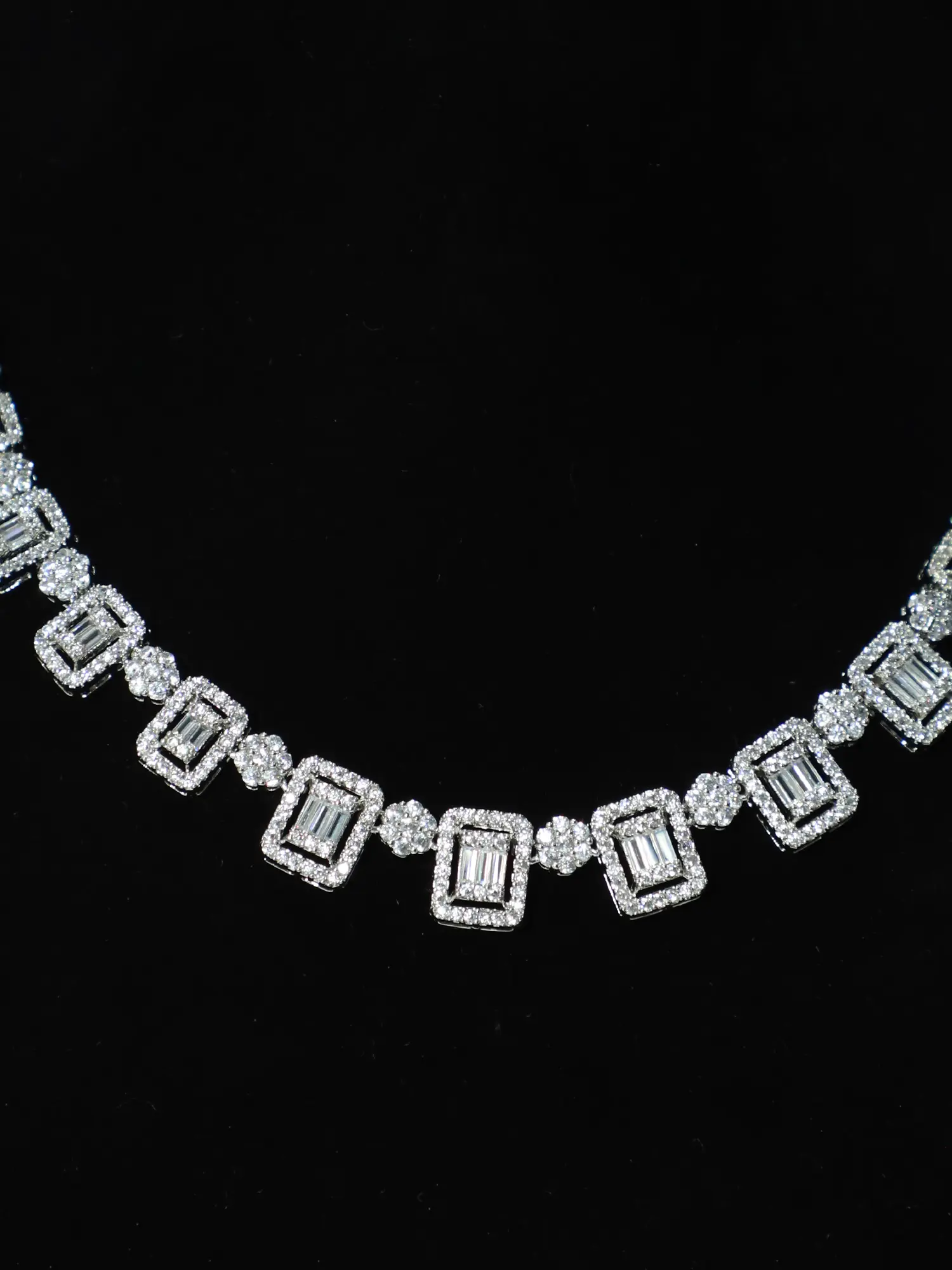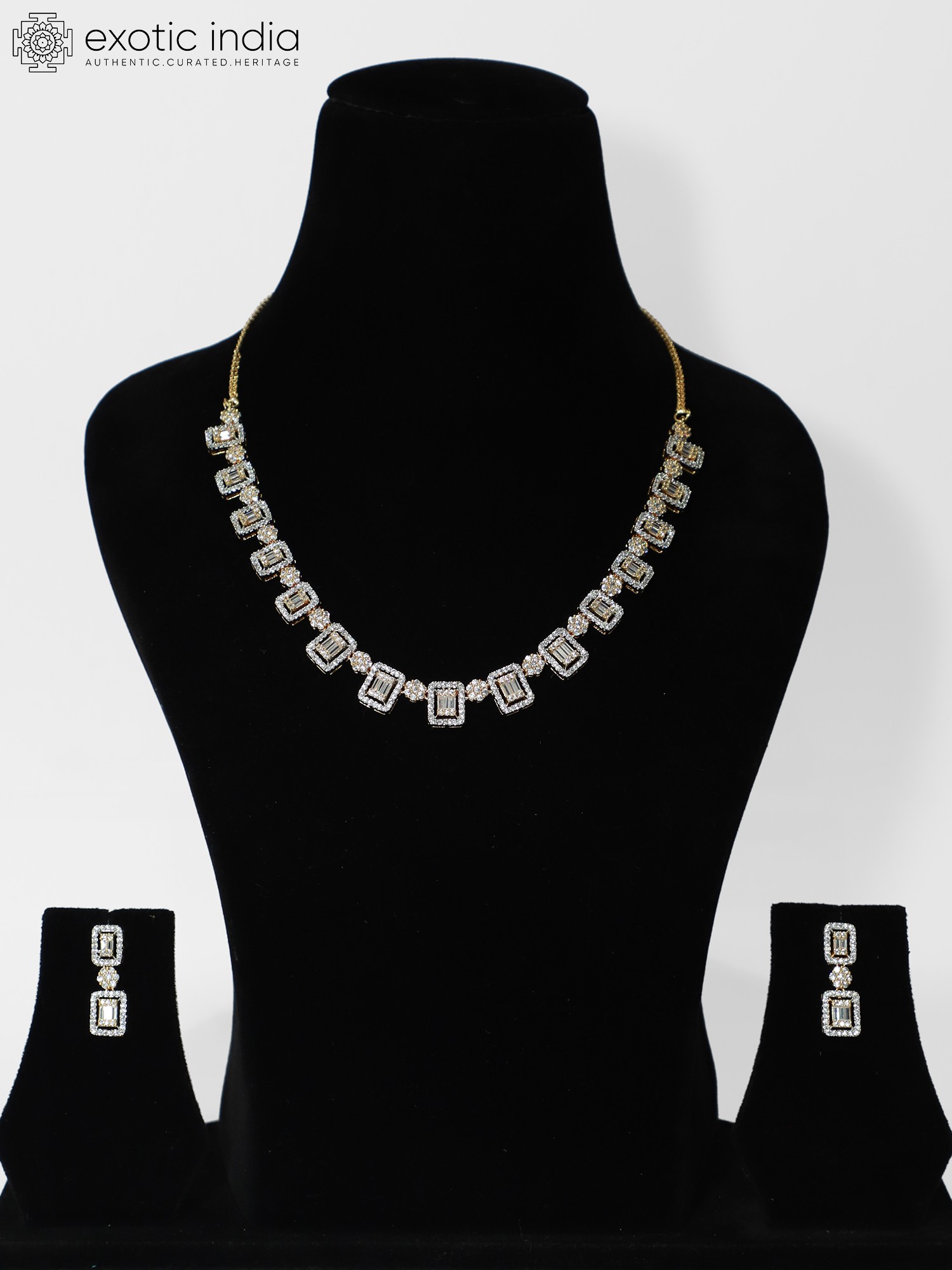 This necklace set is meticulously crafted, ensuring a high-quality finish and lasting durability. The centerpiece of the set is the exquisite stones, known for their brilliance and clarity, mimicking the look of real diamonds. The stones are carefully set in a durable metal that provides a secure and elegant setting.
