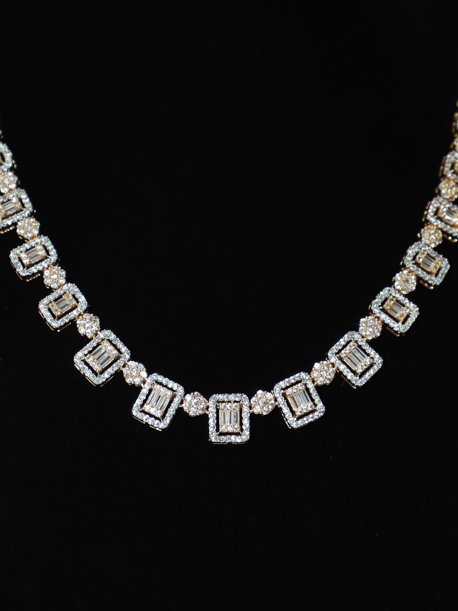 Enhance your attire with this beautifully crafted necklace and earring set, designed to add a touch of glamour to any occasion. Perfect for special events, date nights, or simply to elevate your everyday style, this set is a versatile addition to any jewelry collection. The set features a stunning necklace and matching earrings, both meticulously designed to catch the light and sparkle with every movement. The intricate detailing and sophisticated design make this set a standout piece. Each stone is carefully set to maximize its brilliance, creating a dazzling effect that will draw attention and compliments wherever you go.