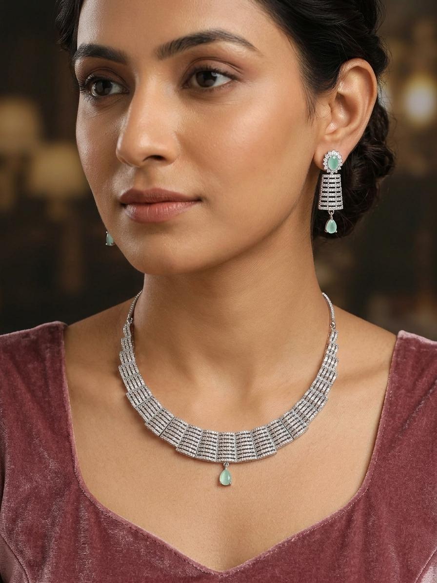 Unique Design Stone Studded Embellished American Diamond Necklace Set With Earrings