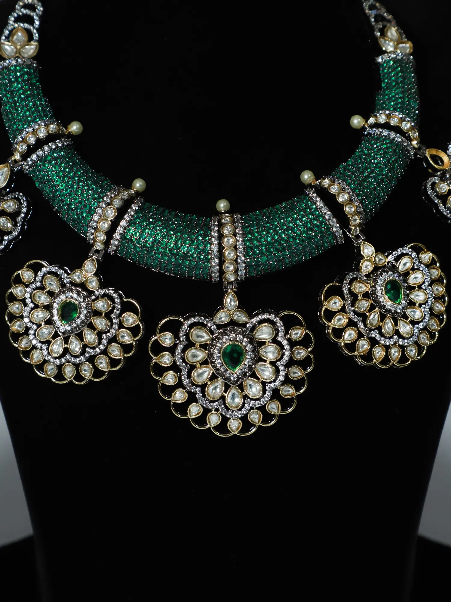 This necklace set is more than just an adornment; it is a statement piece that exudes elegance and sophistication. The vibrant green stones add a touch of vibrancy and freshness, while the copper and kundan create a luxurious and timeless feel. This set is versatile enough to complement a wide range of outfits and occasions. Whether you pair it with a traditional saree or a contemporary gown, this necklace set will undoubtedly elevate your look and add a touch of exquisite charm.