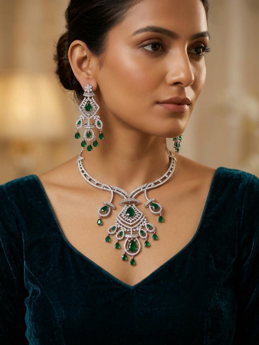 Green Crystal Floral American Diamond Wedding Necklace Set with Stud Earrings