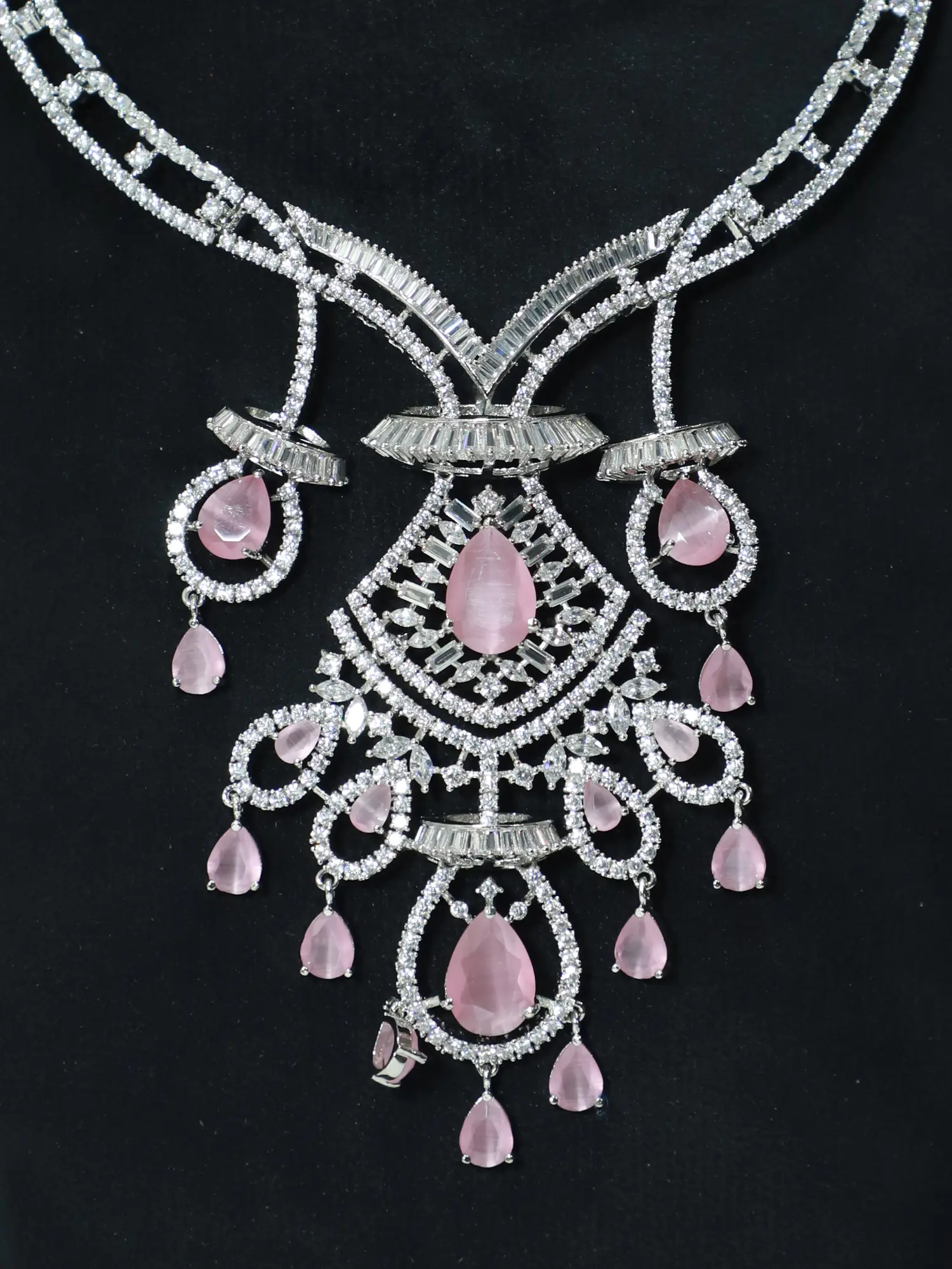 This dazzling set is characterized by its elaborate, cascading design. The necklace features a striking central pendant adorned with meticulously placed stones. This pendant gracefully connects to a necklace chain that is similarly adorned with stones, creating a unified and harmonious look. The earrings mirror the pendant's design, echoing the elegant cascade of stones and offering a beautifully balanced aesthetic. The overall design is both timeless and contemporary, making it a versatile addition to your jewelry collection.