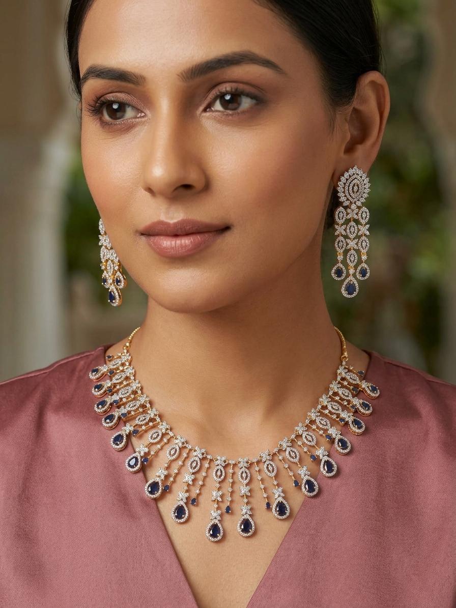 Stunning Design Elegant Stone Studded Embellished American Diamond Necklace Set With Earrings