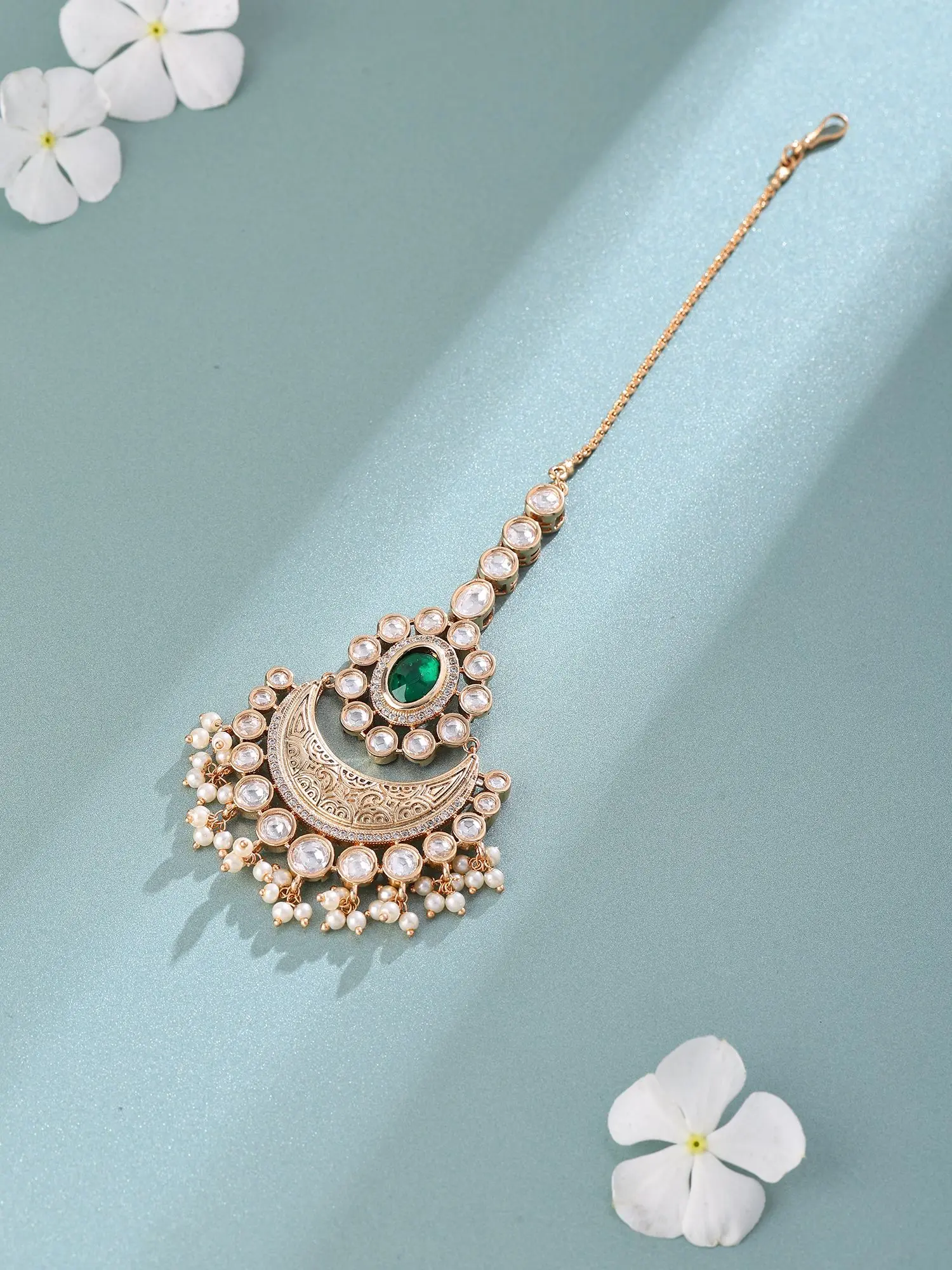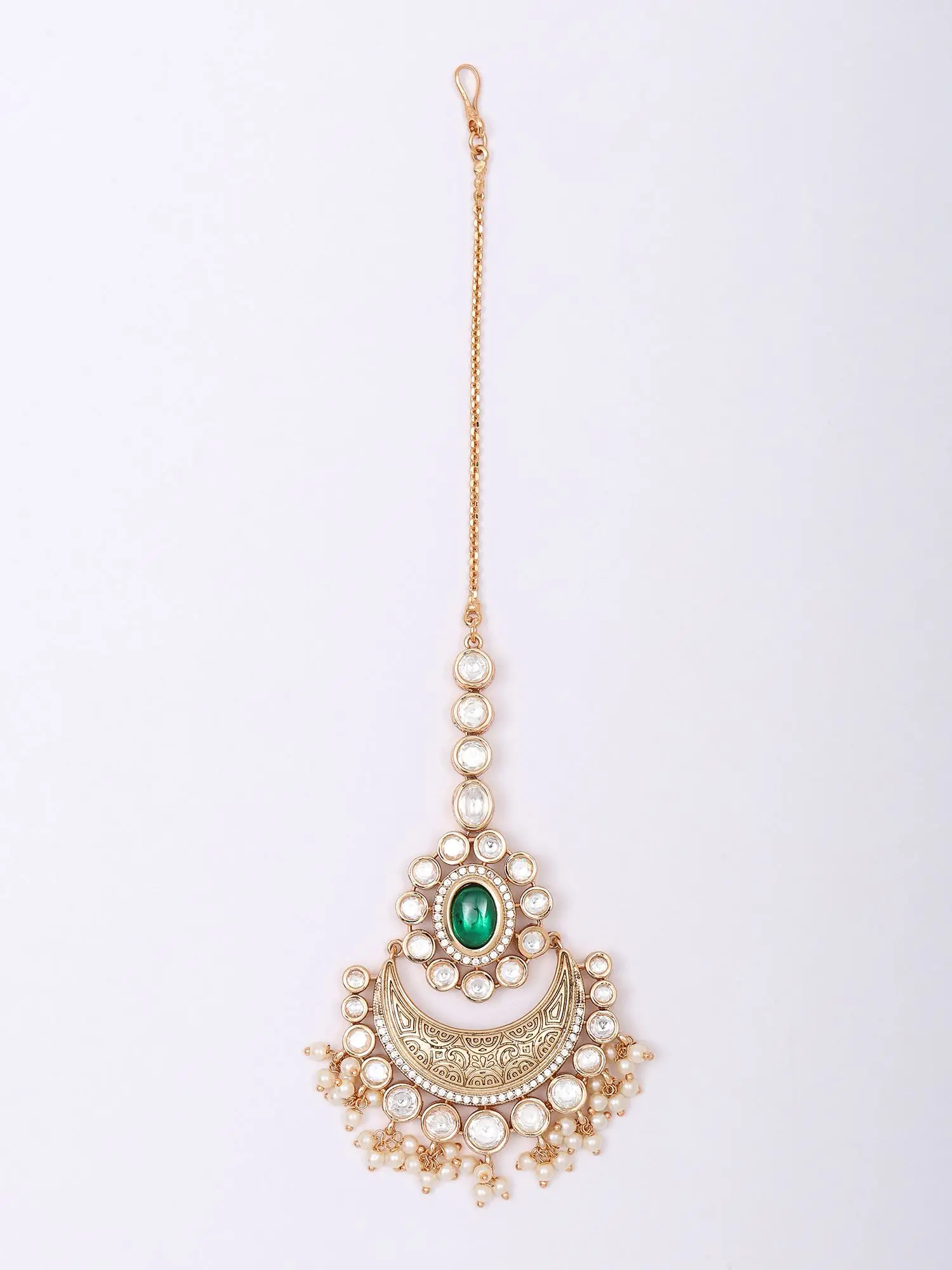Stone Studded Kundan Meenakari Crescent Style Maang Tikka with Bead Drops