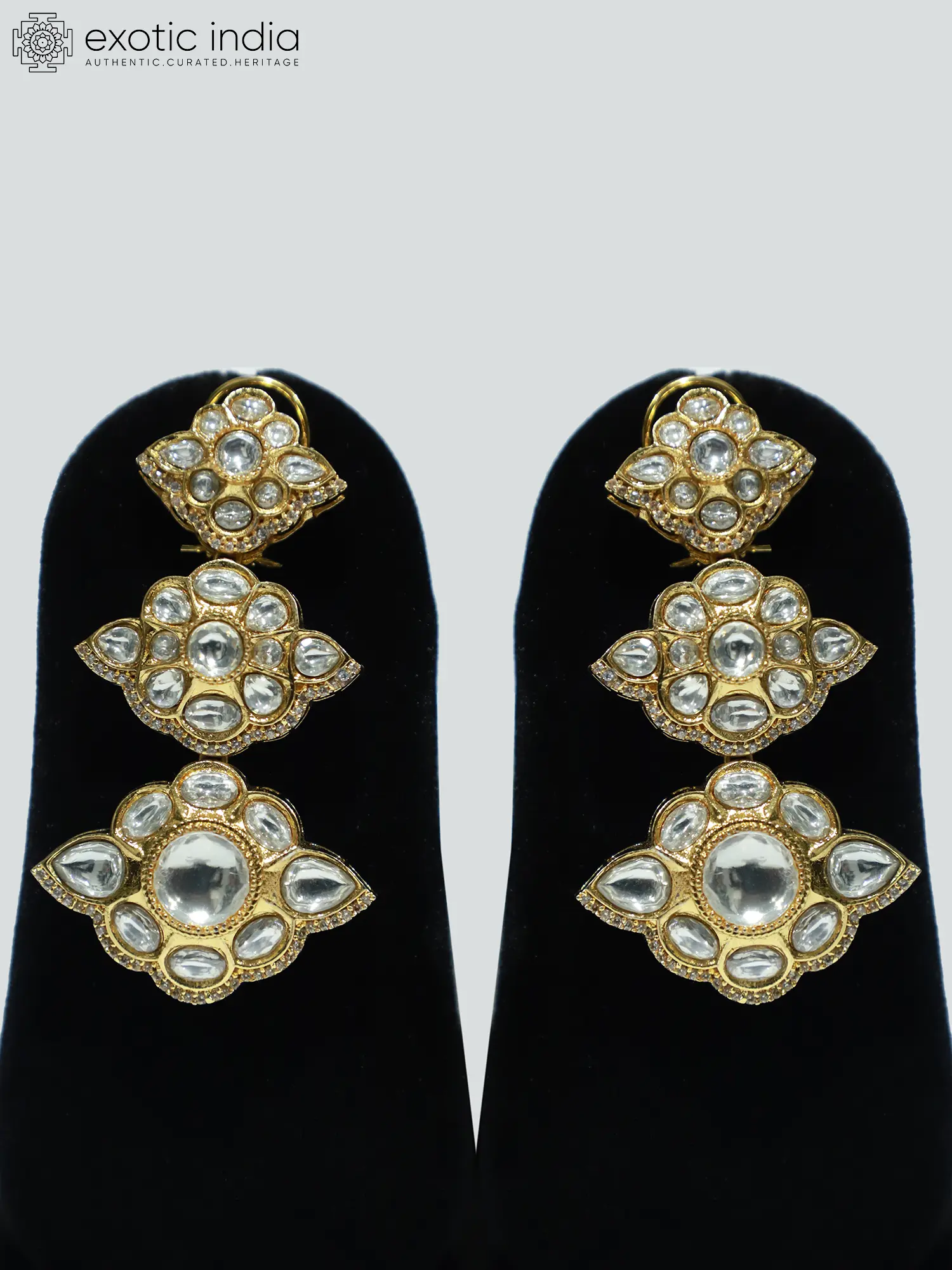 The centerpiece of this stunning set, the necklace, is a showstopper. Its 20.5-inch length gracefully drapes around the neck, drawing attention to your neckline. The cascading design features a series of beautifully crafted floral motifs, each intricately embellished with shimmering stones. The interplay of light and shadow on the meticulously arranged Kundan stones creates a dazzling effect, transforming this piece into a true masterpiece of jewelry artistry. The necklace's substantial yet delicate design provides a perfect balance of boldness and sophistication, making it equally suitable for both formal and semi-formal events.