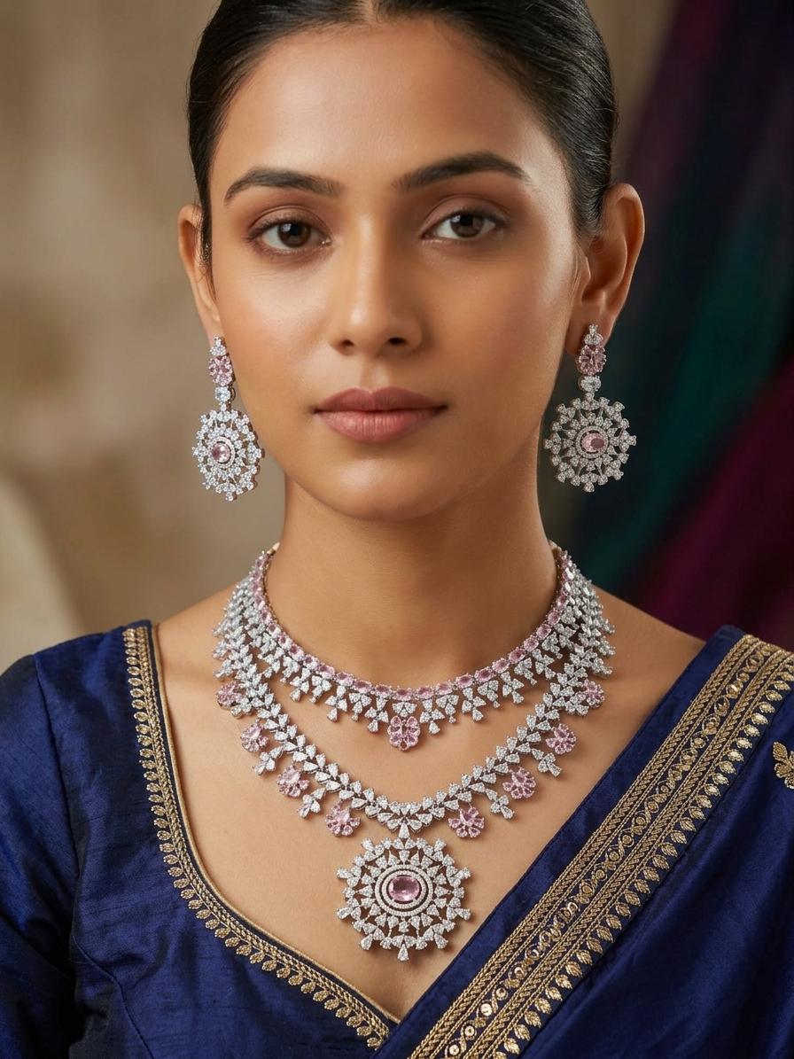 Stone Studded Exquisite American Diamond Necklace Set With Earrings