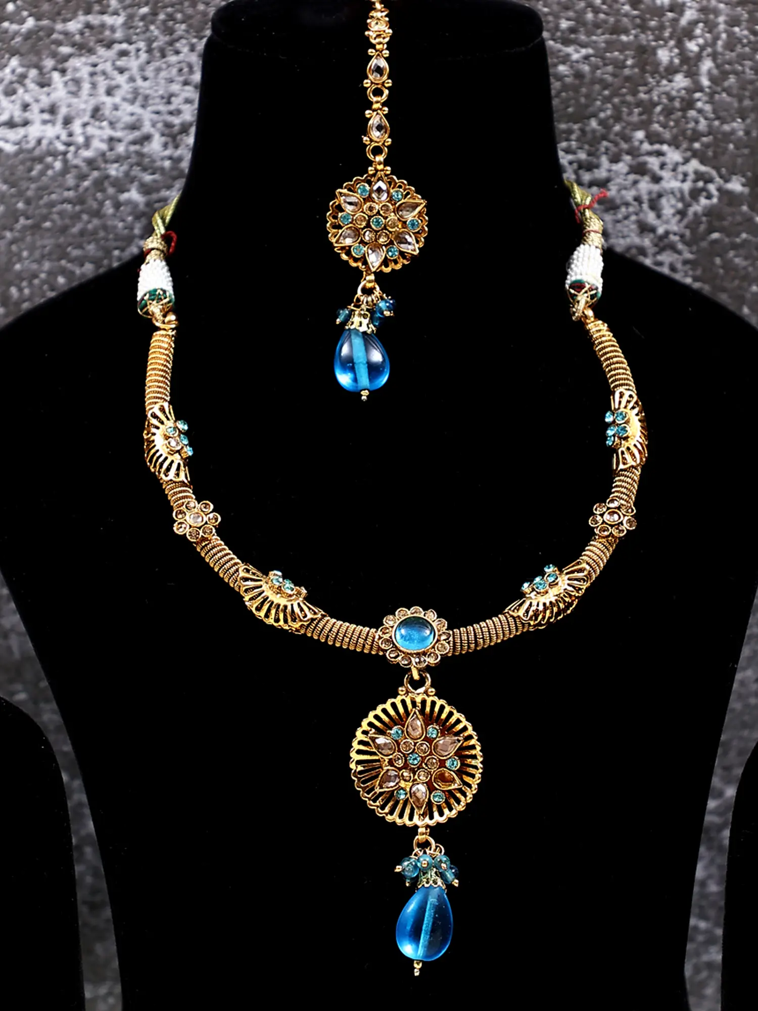 Dazzle in elegance with our stone-studded fashion necklace set. This beautiful necklace features carefully placed stones that create a captivating and glamorous design. The necklace, adorned with studded stones, adds a touch of opulence to the neckline. The set includes coordinating earrings, completing your look with a harmonious and stylish flair.