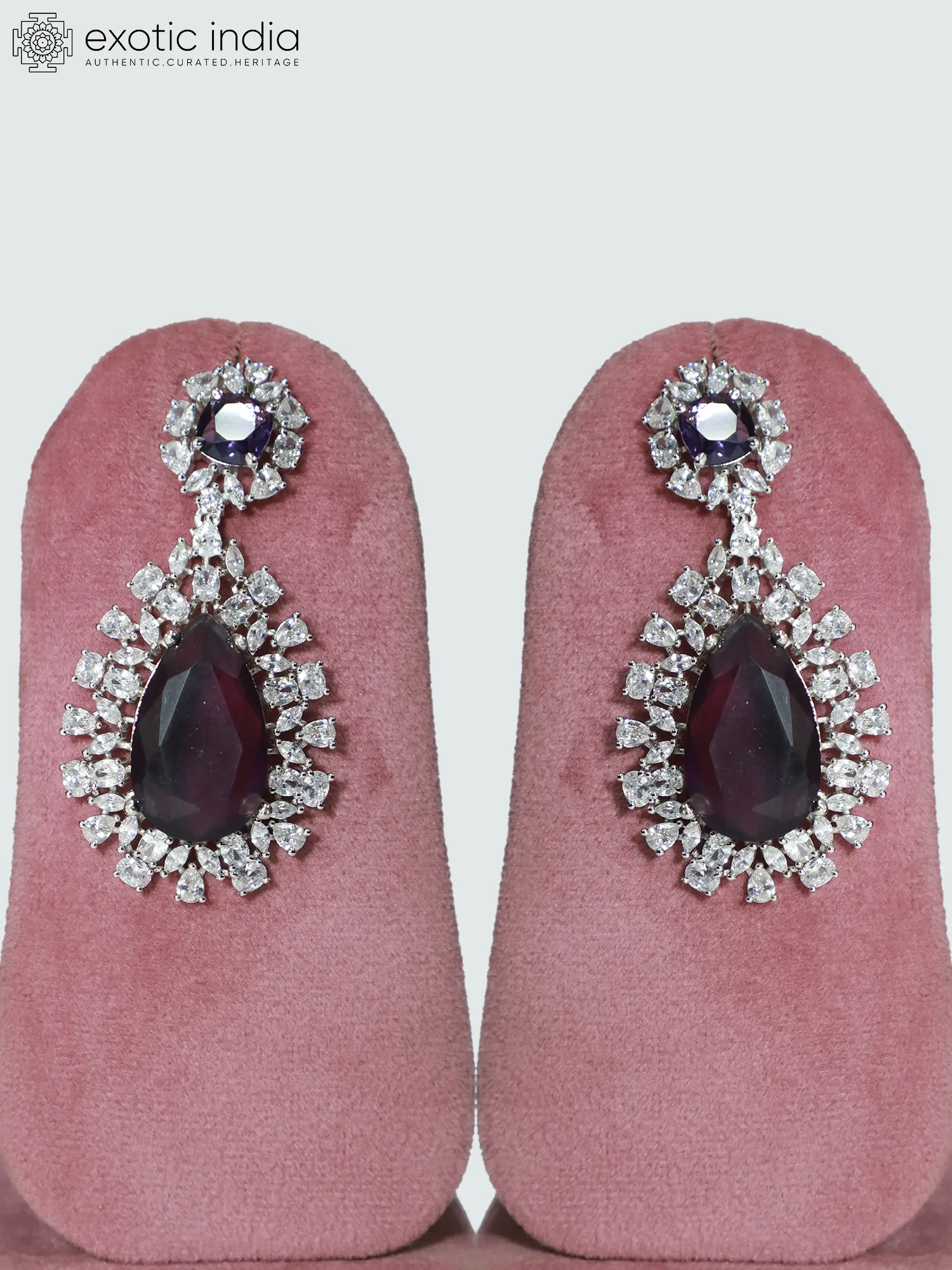 The addition of ruby stones serves as a masterful touch, introducing a pop of rich color that beautifully complements the sparkling brilliance of the American diamonds. These ruby stones are carefully integrated into the floral motif, providing a subtle yet striking contrast against the clear stones. The deep red hues of the rubies add a touch of warmth and vibrancy, enriching the overall design. This blend of colors and textures provides a truly unforgettable visual experience. The strategically placed rubies are not overpowering, instead acting as accent pieces to enhance the existing design's splendor.