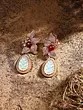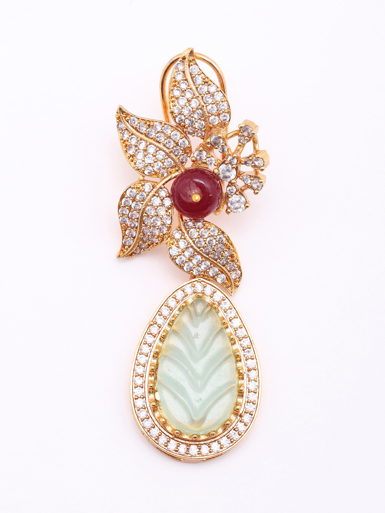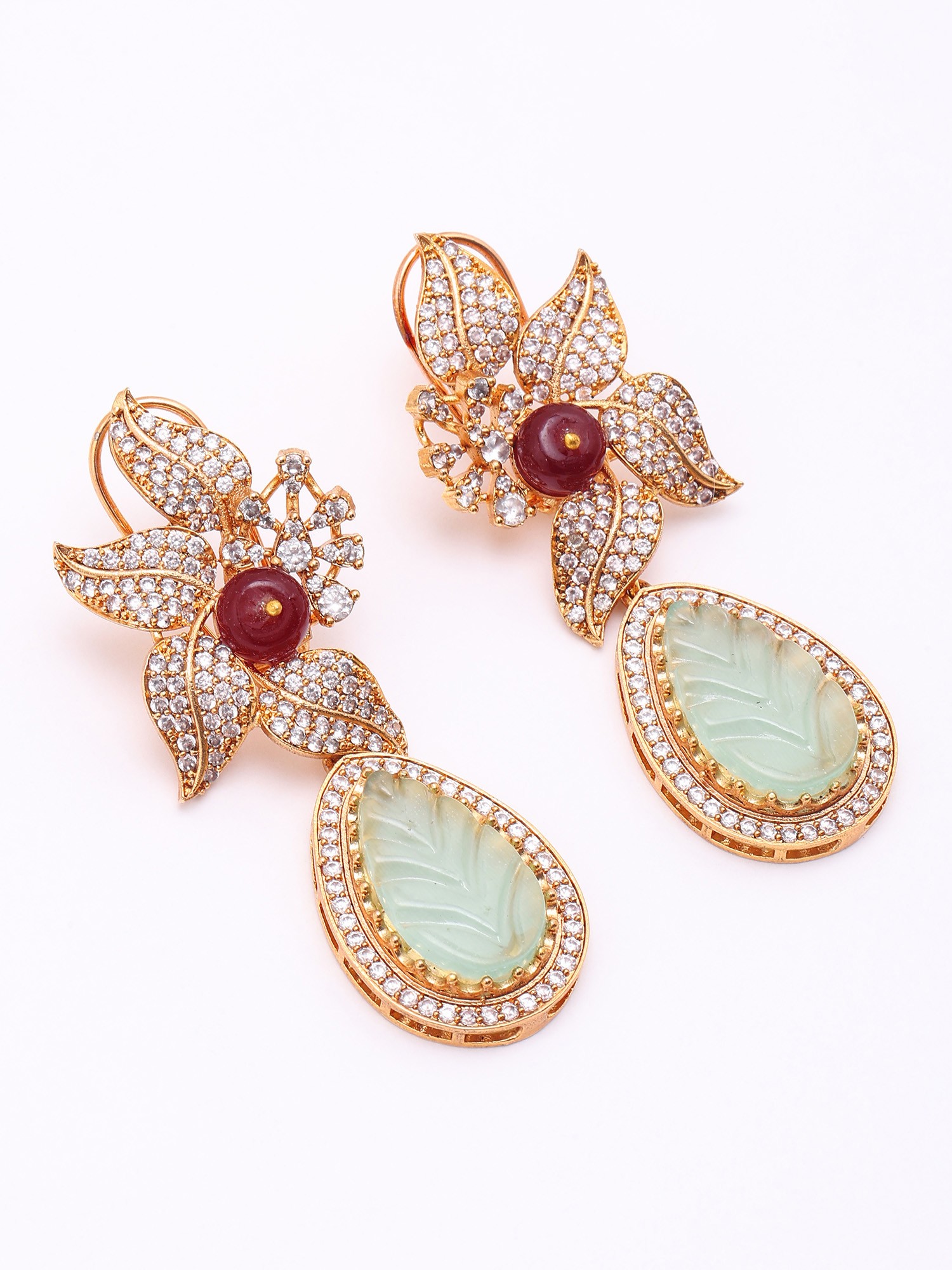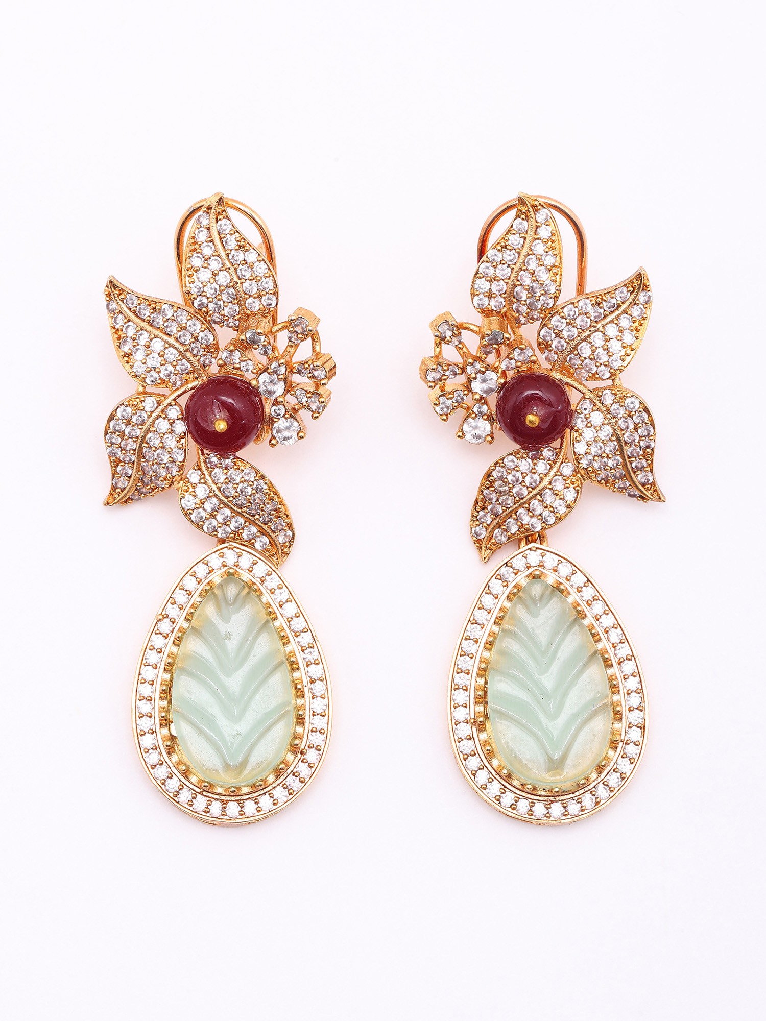 The earrings are expertly fashioned from brass, chosen for its durability and ability to hold intricate designs. The floral component is studded with shimmering stones that add a brilliant sparkle to the overall design. Below the flower is a single, deep-red cabochon. From the base of the flower, a gently carved, tear-drop-shaped pendant in a soft, celadon green hangs suspended. The teardrop pendant is also encircled by small stones. The clasp style is a curved shepherd's hook, perfect for ease of wear and securing the earring. These earrings are a blend of classic design and contemporary flair, making them a versatile addition to any jewelry collection.