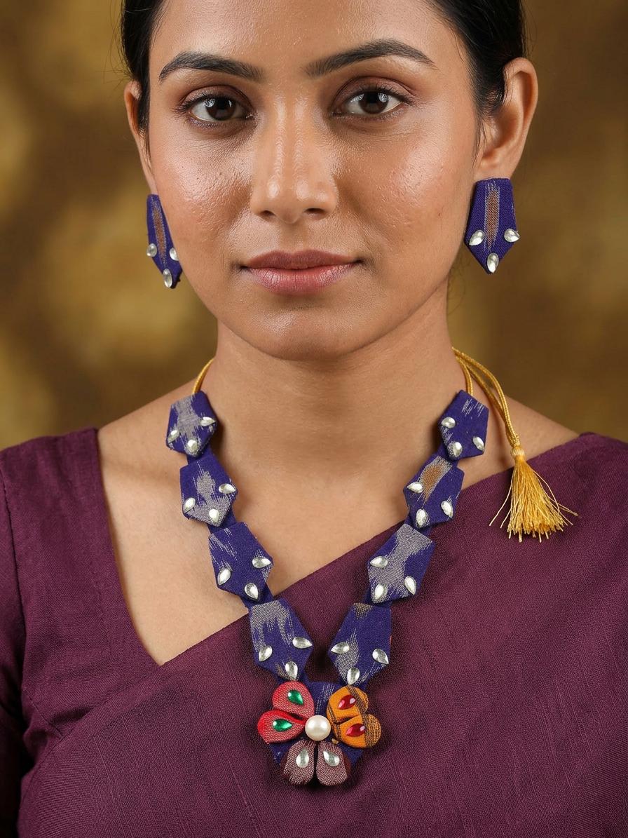 This exquisite necklace and earrings set is a true testament to the artistry of handcrafted jewelry. Each piece is meticulously designed and crafted, showcasing a beautiful blend of traditional Sambalpuri fabric and contemporary design. The vibrant hues of the deep indigo blue fabric are beautifully accented with sparkling stones, creating a captivating visual appeal. This set is perfect for adding a touch of elegance and sophistication to any outfit.