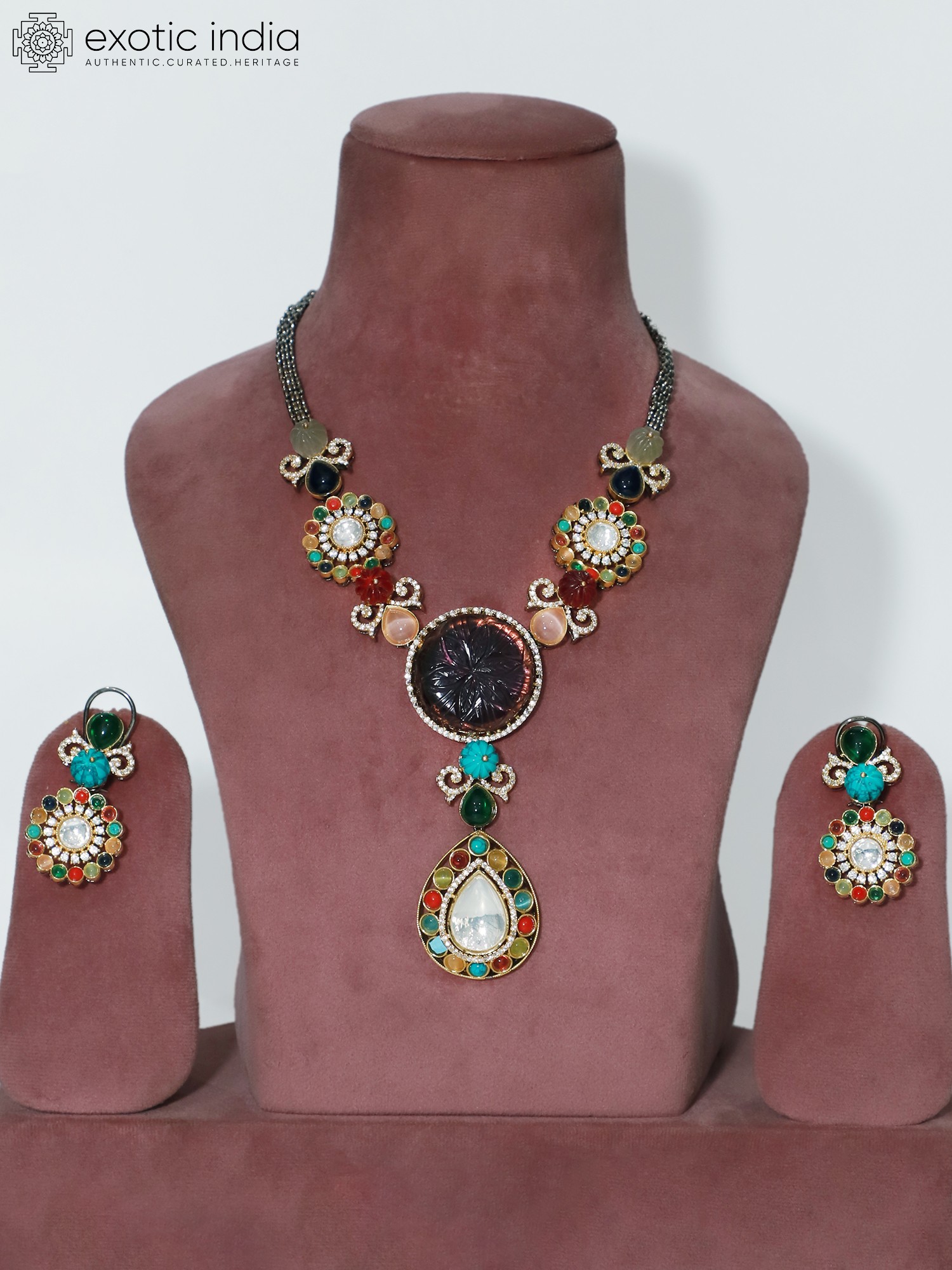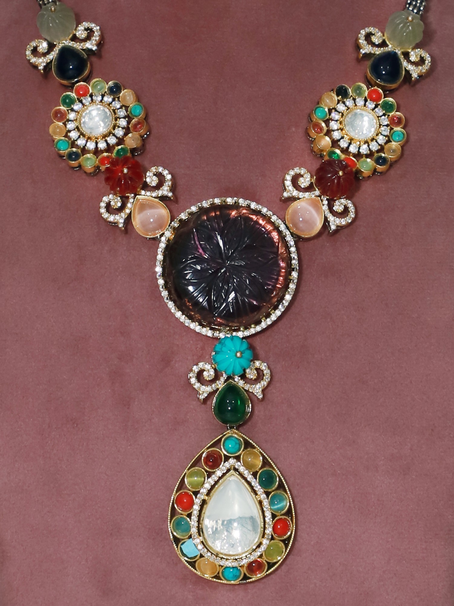 Crafted from high-quality brass, this necklace set is a testament to enduring quality and exquisite craftsmanship. The brass provides a rich, warm backdrop for the vibrant gemstones, allowing their colors to shine with unparalleled brilliance. The stones themselves are carefully selected and expertly set, ensuring a secure and long-lasting hold. This necklace set is designed to be more than just a fleeting fashion statement; it's an heirloom-quality piece meant to be treasured for years to come. The attention to detail, from the secure clasp to the perfectly aligned stones, speaks to the unwavering commitment to excellence that defines this creation.