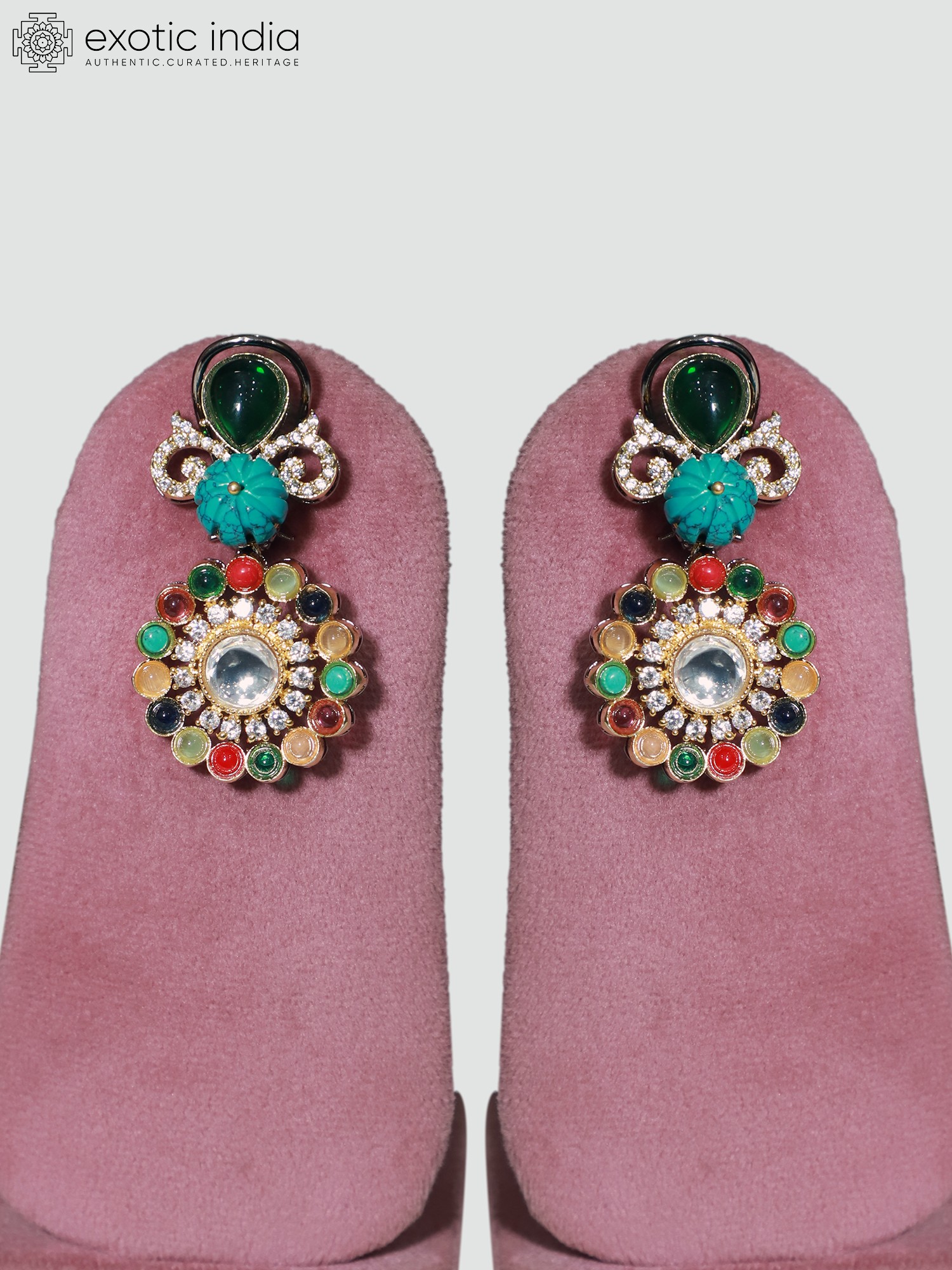 Victorian Style Green Stone Studded Long Necklace and Earring Set