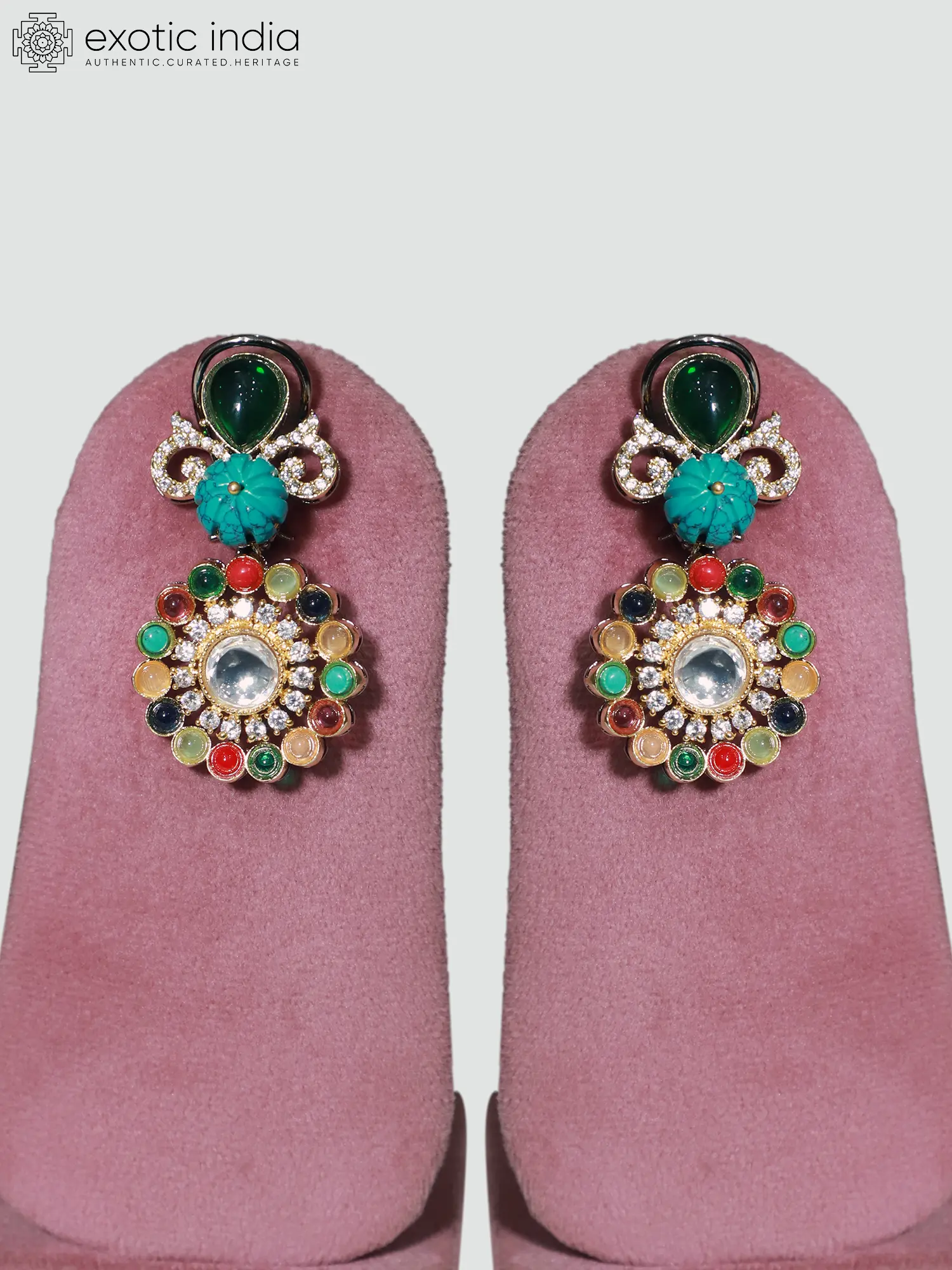 The necklace's focal point is a captivating pendant, featuring a carved stone encircled by a halo of brilliantly cut gemstones. This stunning central piece is elegantly suspended from a delicate chain adorned with a series of smaller, equally exquisite floral motifs. Each flower is a miniature marvel, showcasing the meticulous attention to detail that defines this piece. The rich color palette, comprised of vibrant turquoise, deep reds, and sparkling whites, creates a mesmerizing interplay of hues that will catch the eye and steal the heart. The earrings perfectly complement the necklace, echoing its design with smaller, yet equally stunning floral motifs. They feature the same exquisite color combination, creating a harmonious and coordinated look.
