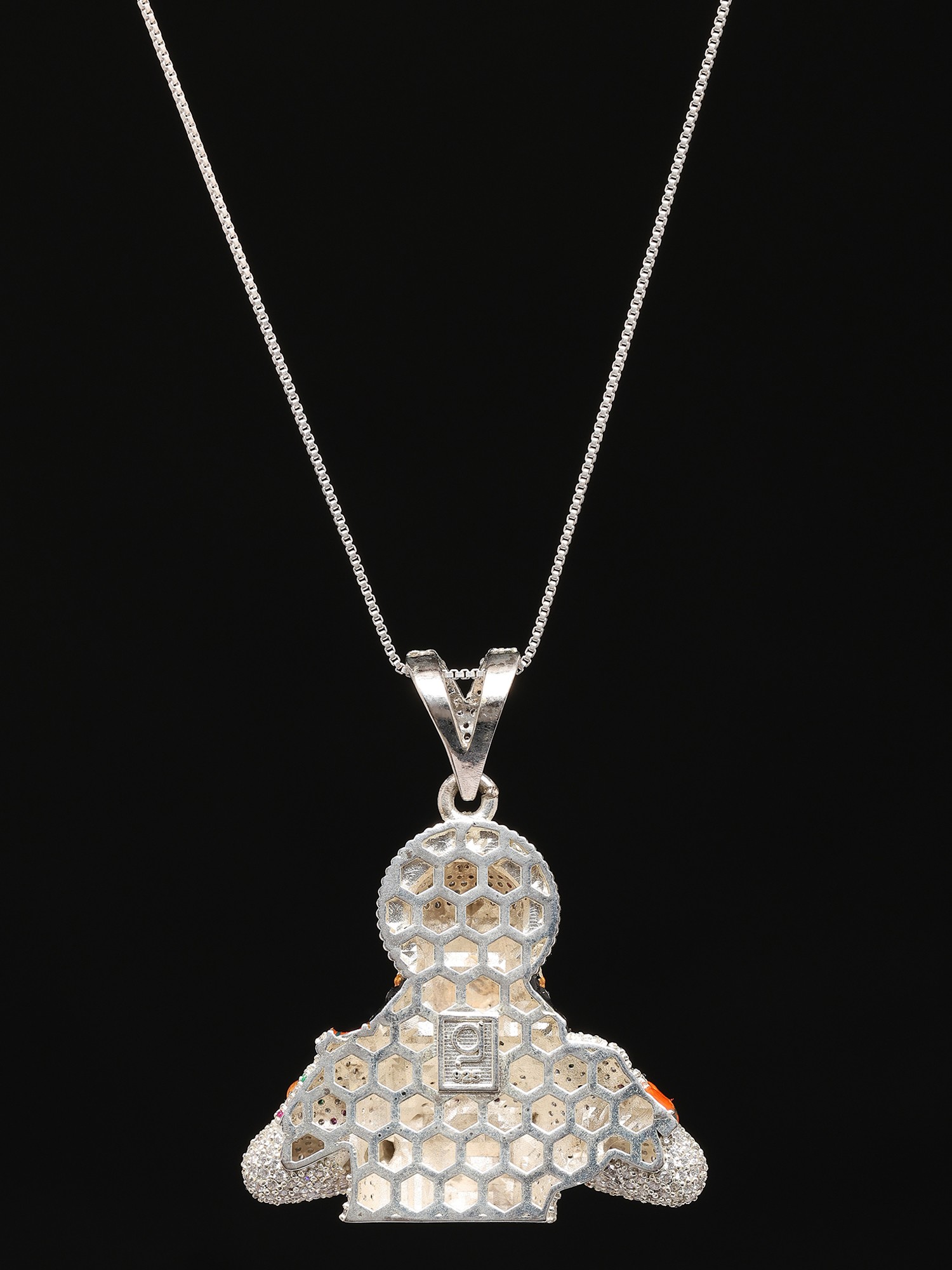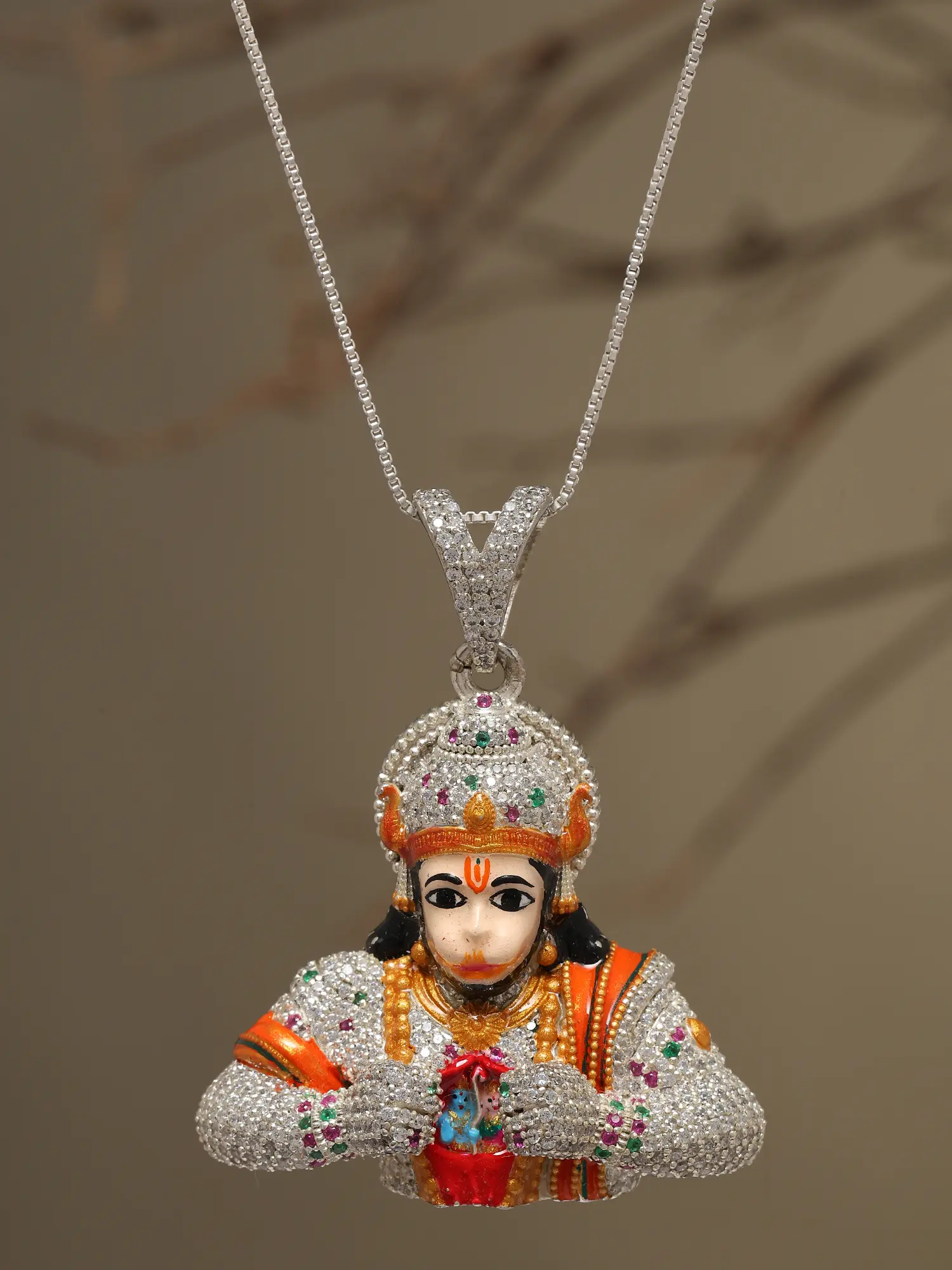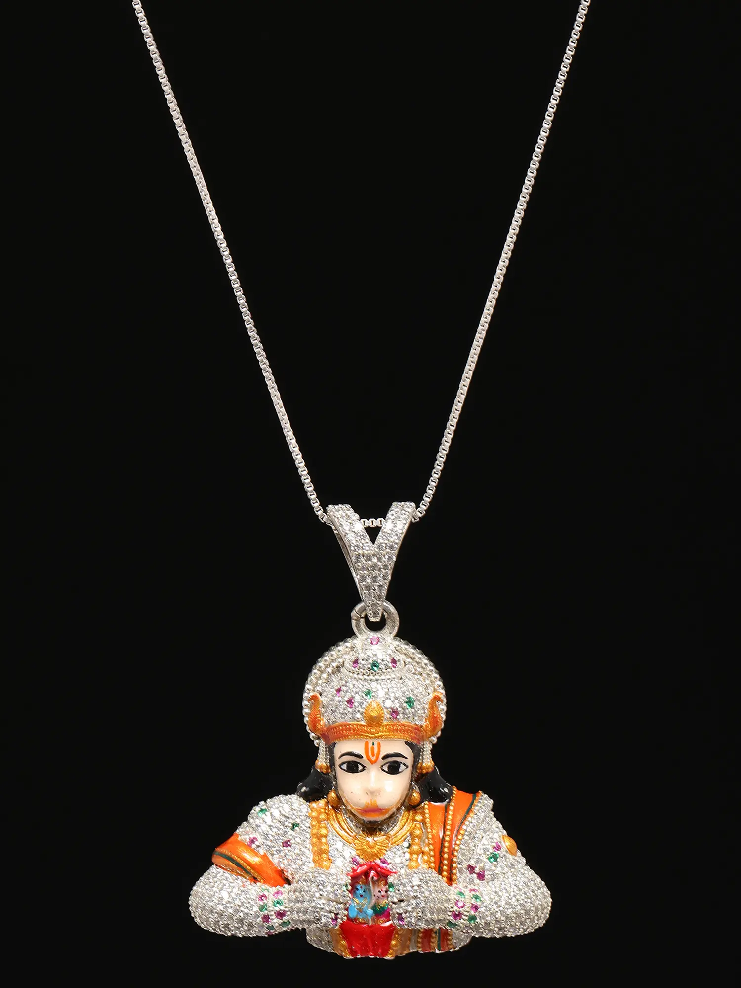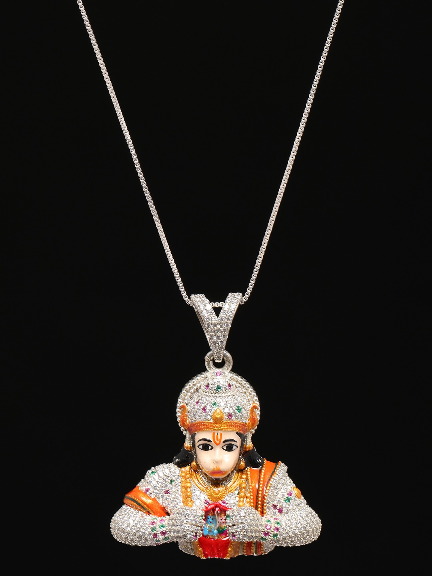 Meticulously crafted from sterling silver, this pendant showcases unparalleled artistry and attention to detail. The intricate detailing brings the story of Hanuman's devotion to life in a wearable form. The entire surface of the pendant is adorned with carefully placed stones, adding a radiant sparkle and enhancing its visual appeal. The stones catch the light beautifully, creating a dazzling effect that draws attention to the wearer. The meticulous arrangement and color coordination of the stones further enhance the design, adding depth and dimension to the piece. The pendant's design perfectly captures the essence of the divine scene, providing a sense of peace and spirituality to the wearer. Every aspect of this pendant is designed to be visually captivating and spiritually uplifting.