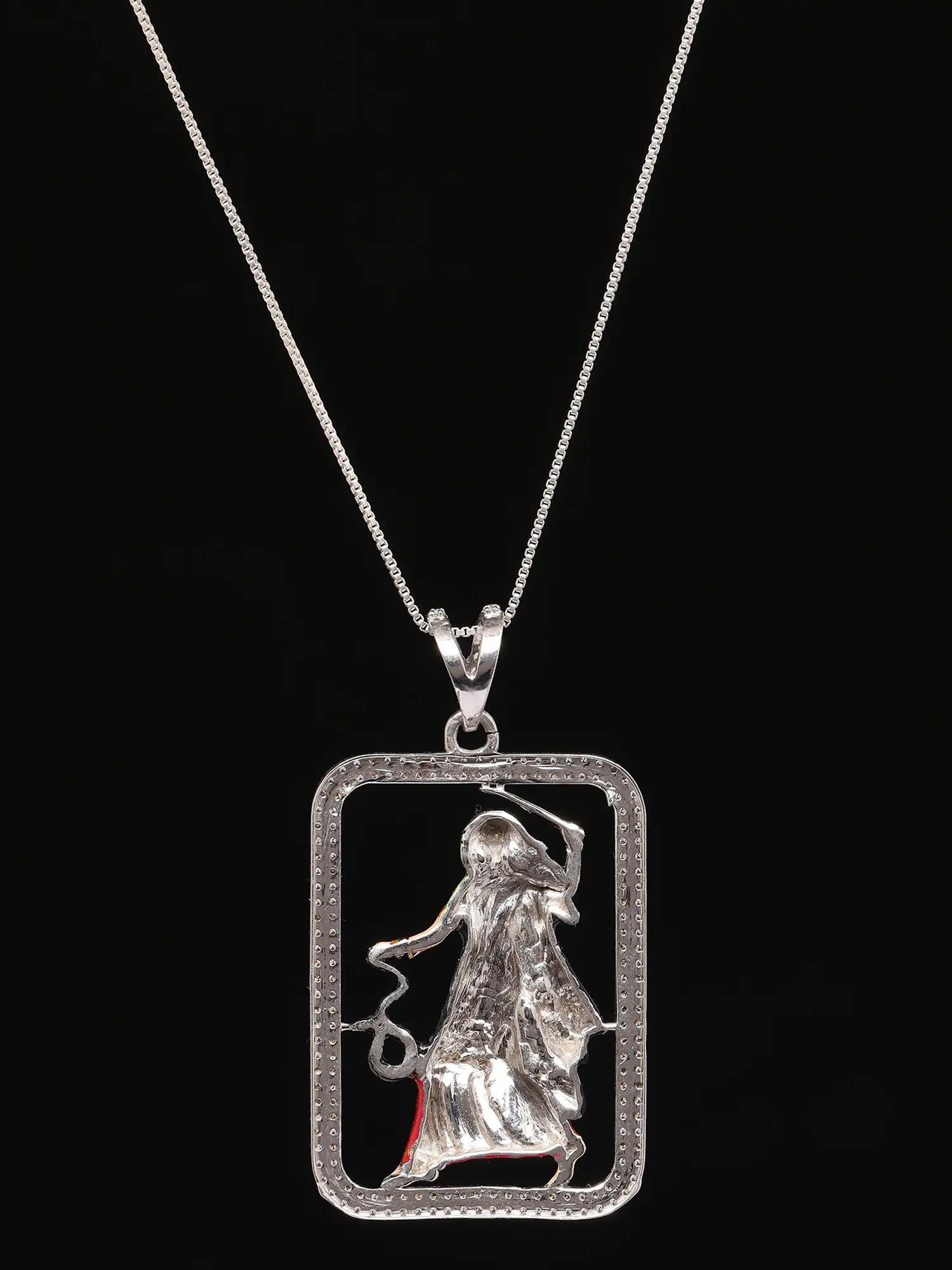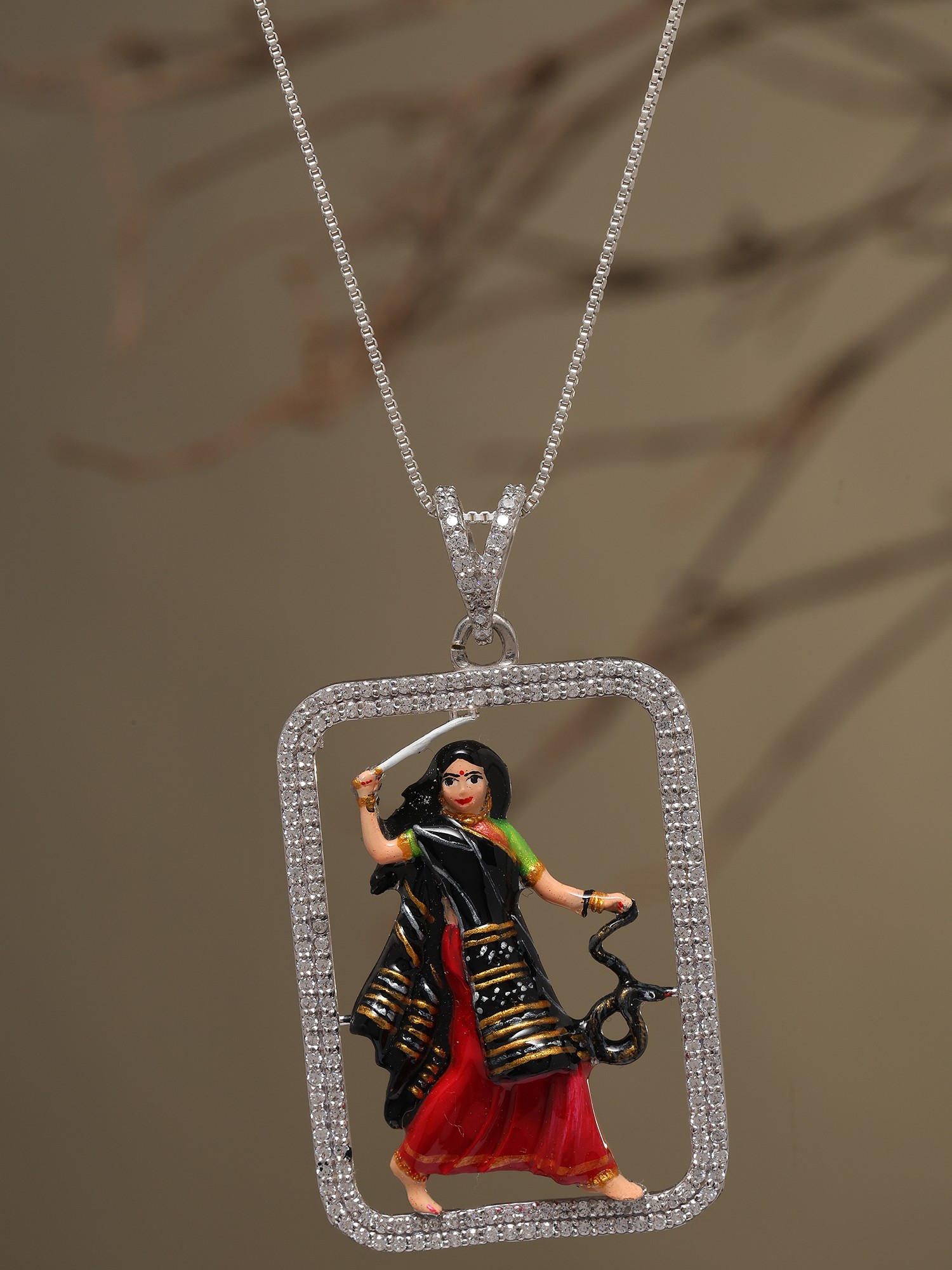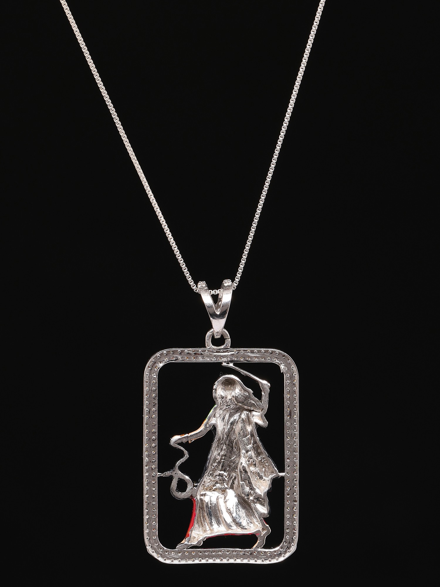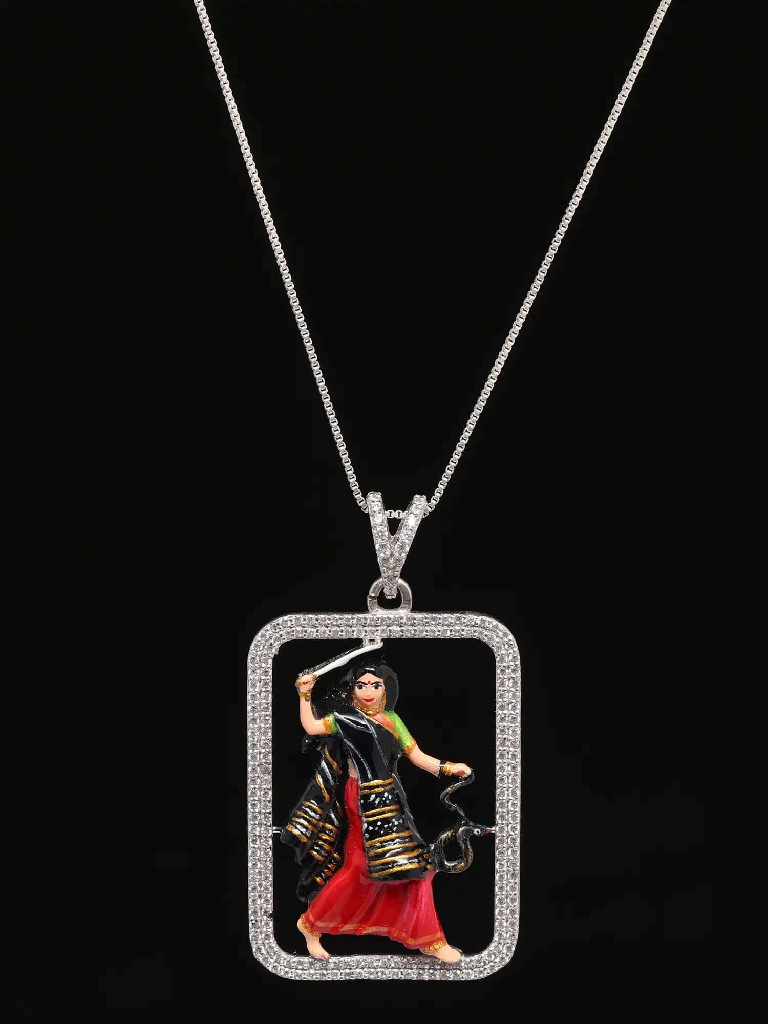 The use of sterling silver elevates this pendant to a true statement piece. Not only does it provide a lustrous backdrop for the Mogal Maa, but it also offers lasting quality and shine. Sterling silver is renowned for its durability and tarnish-resistance, making this pendant a practical and beautiful choice for everyday wear. The bright, reflective surface of the silver complements the colorful depiction of the deity, enhancing the overall visual impact. The pendant hangs gracefully from a chain (not included), allowing it to be showcased with pride.