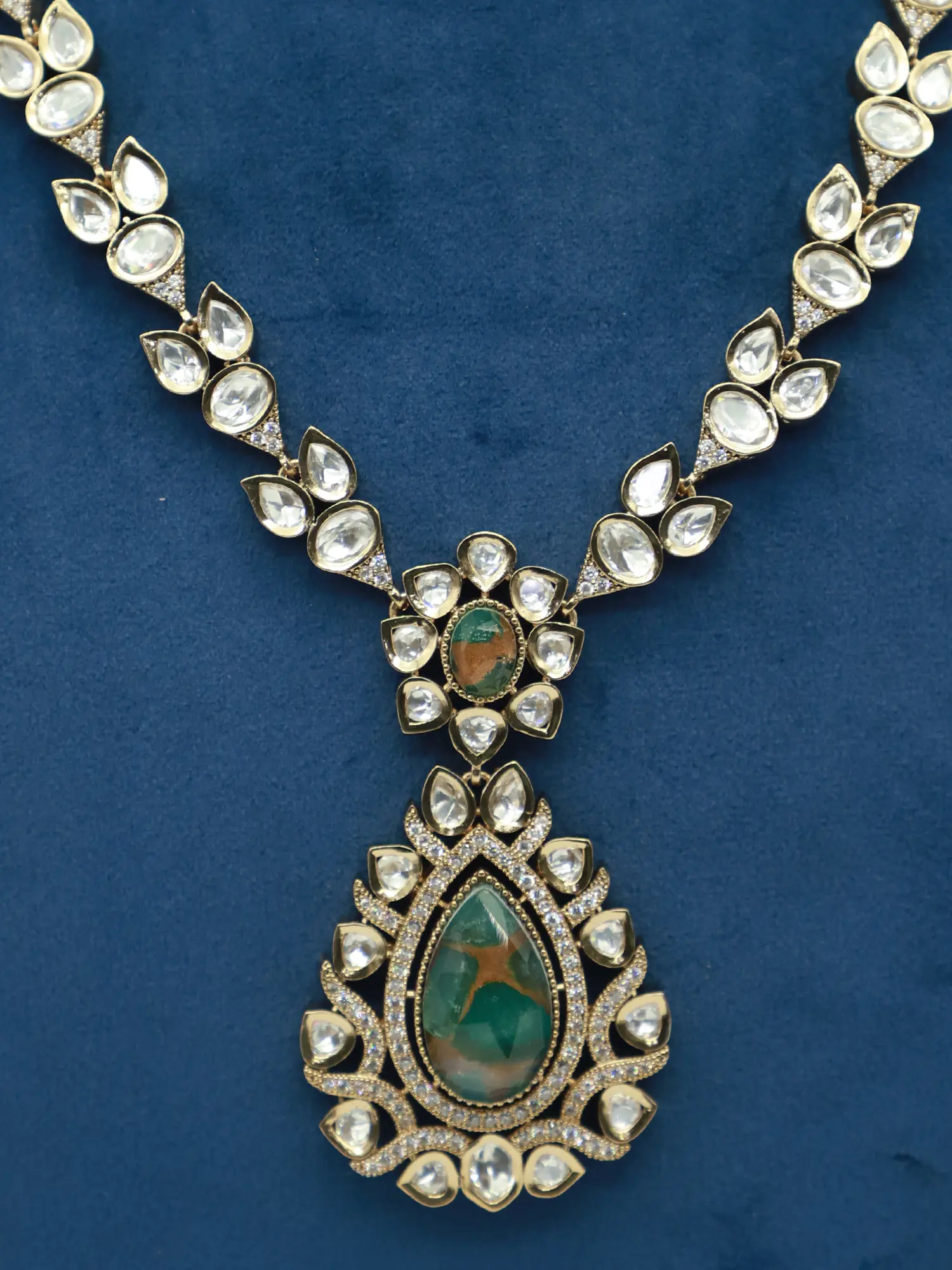 Adorn yourself with this striking necklace and earring set, a true embodiment of opulent design and meticulous craftsmanship. This set features a harmonious blend of traditional and contemporary aesthetics, designed to enhance your natural beauty and elevate any ensemble. The necklace showcases an intricately crafted chain, designed to gracefully adorn the neckline. Delicate, tear-drop shaped stones are linked together and framed by shimmering stones which further enhance the inherent brilliance of the piece. The centerpiece pendant features a prominent teardrop stone, surrounded by shimmering stones that catch and reflect the light with every movement.