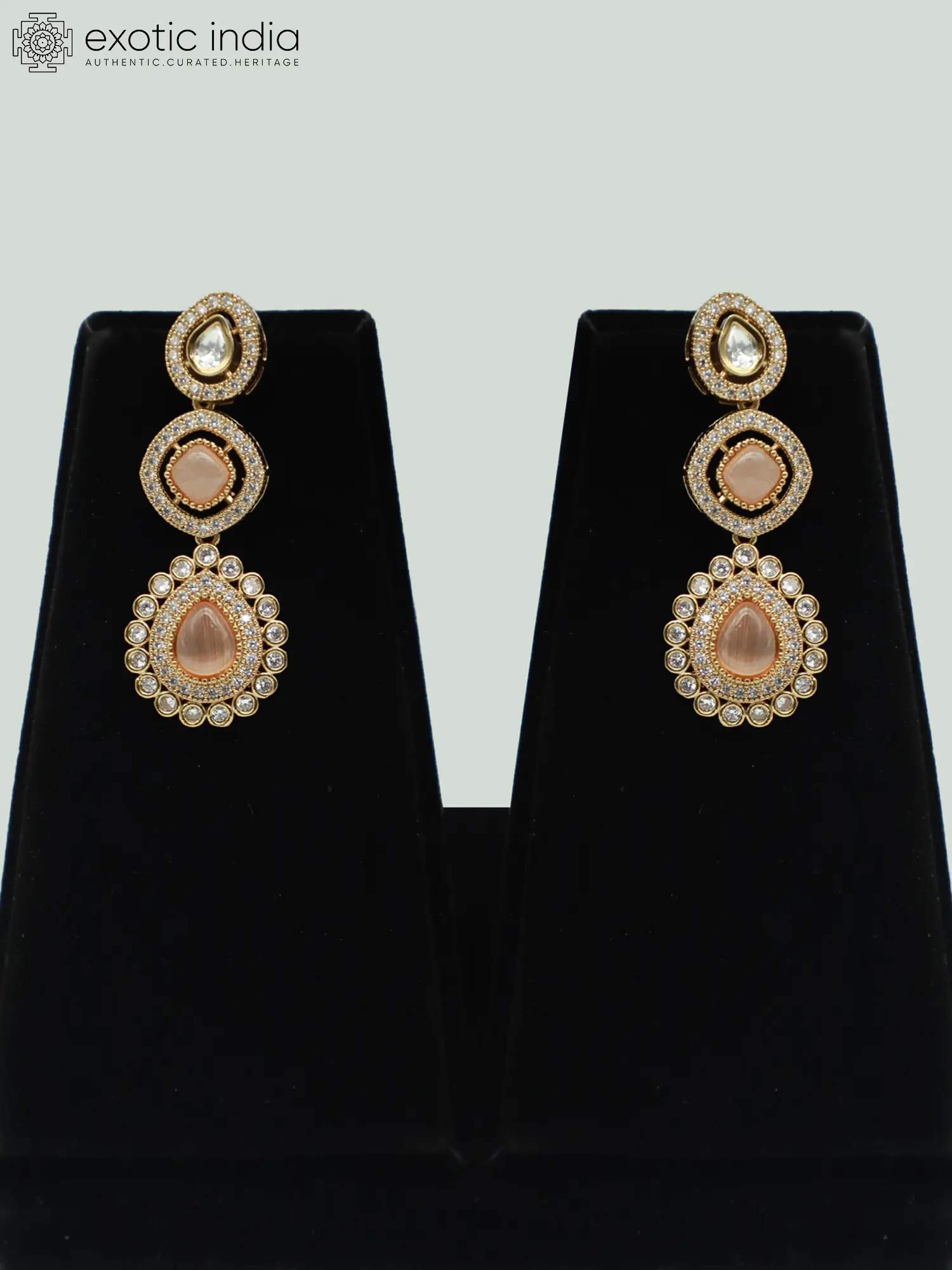This jewelry set is made from brass. The brass provides a durable and lustrous foundation for the design, ensuring longevity and radiance. The intricate stone settings are carefully placed to maximize sparkle and create a dazzling effect.